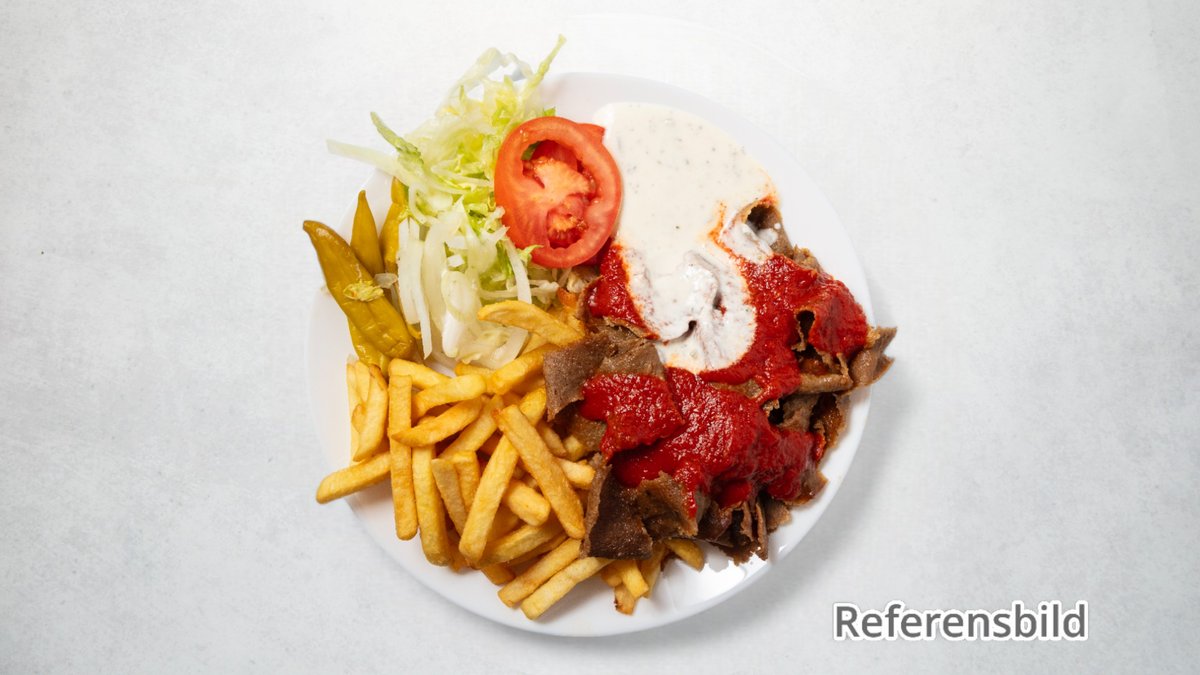 Med isbergssallad, tomat, , feferoni, lök och kebabsås. Välj mellan pommes frites och ris i nästa steg. (Halal)