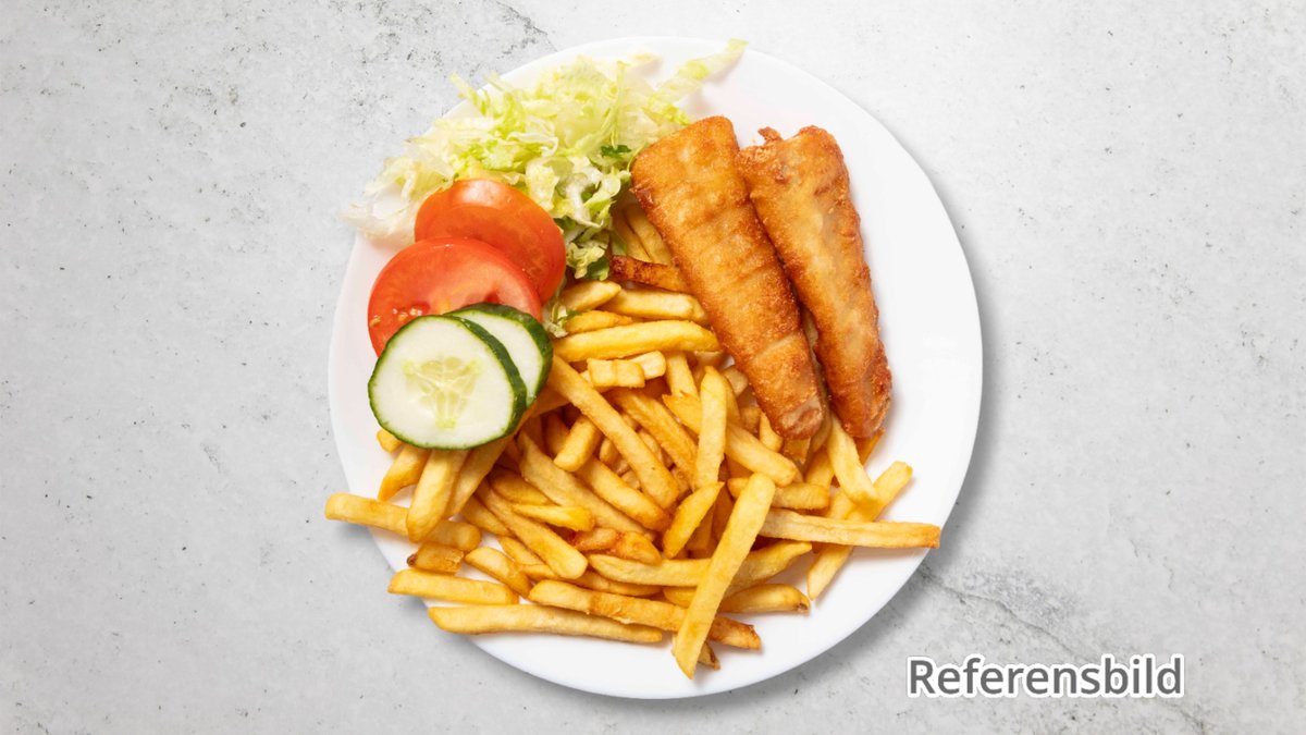 Friterad fisk, remouladsås och pommes frites.