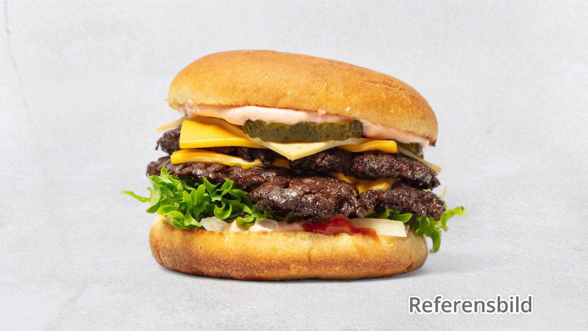 300 g kött av högrev, cheddarost, hamburgaredressing, senap, ketchup, lök och inlagd gurka. Serveras med pommes.