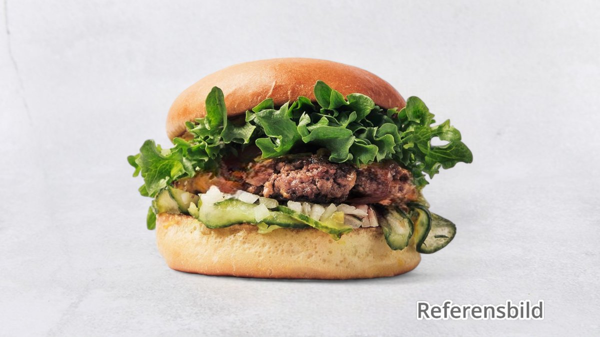 100 g kött av högrev, cheddarost, hamburgaredressing, senap, ketchup, lök och inlagd gurka. Serveras med pommes.