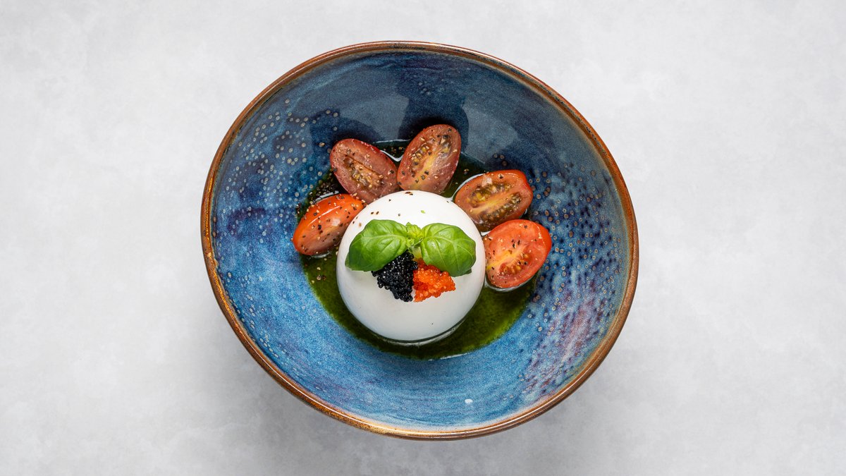 Krämig buffelmozzarella med basilikaolja och fiskrom.