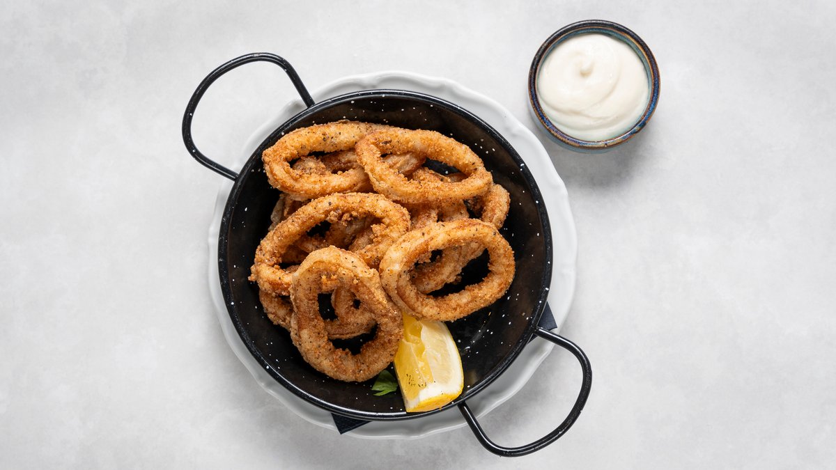 Friterade bläckfiskringar, serveras med aioli.