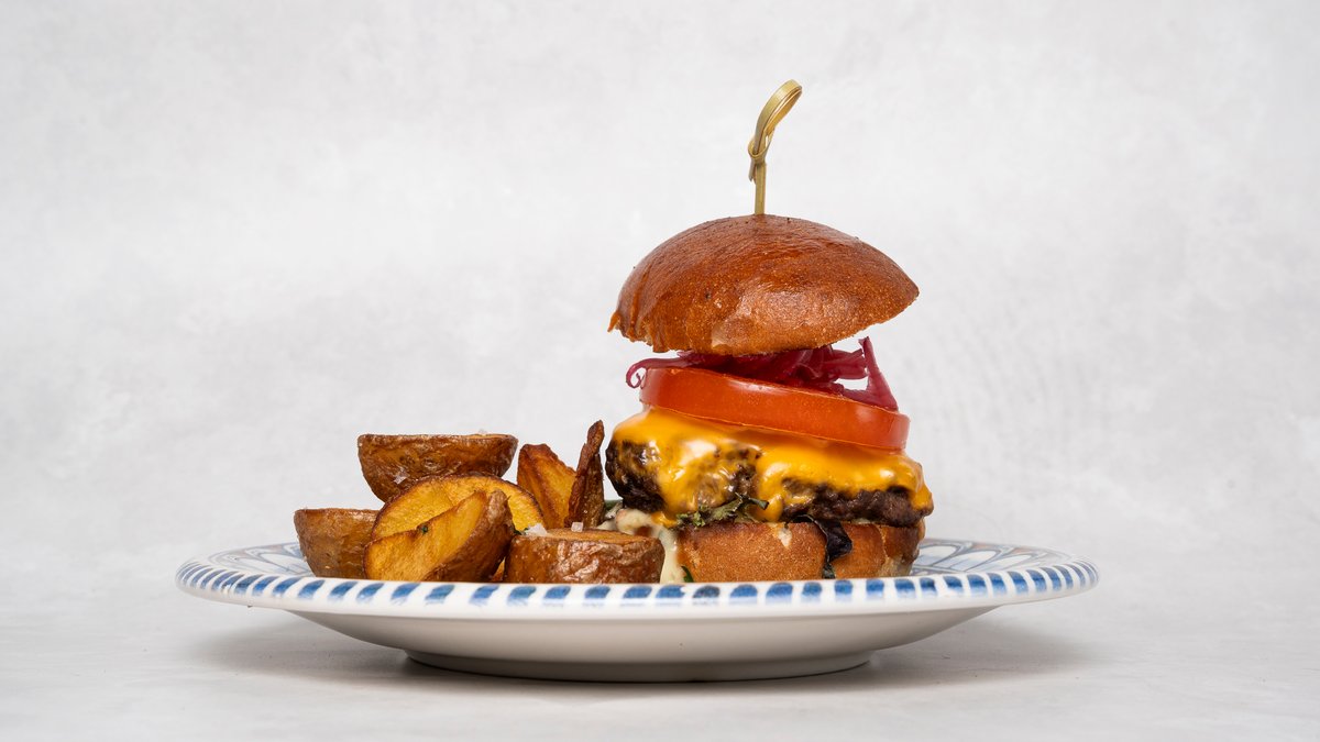 Hamburgare med picklemajonnäs, ost, tomat och karamelliserad lök.