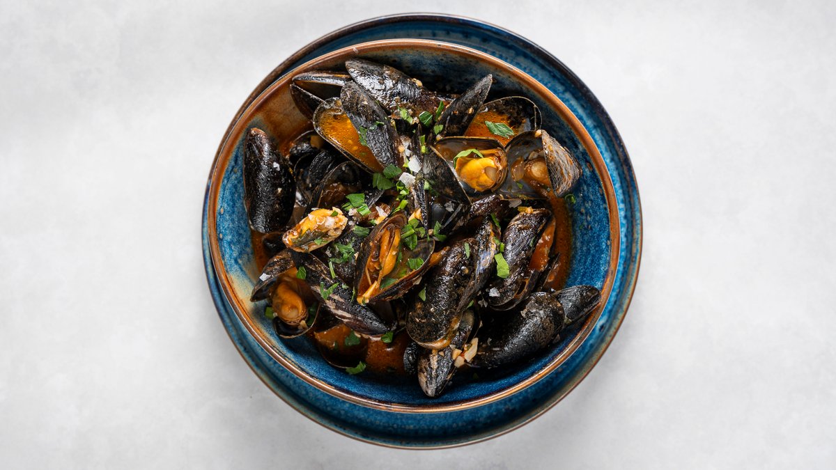 Blåmusslor i vitvin och grädde, serveras med vitlöksbröd.