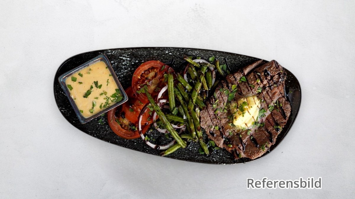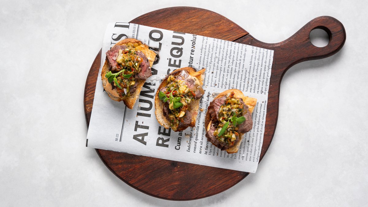 Rostat bröd med flankstek, chimichurri och chiliaioli.