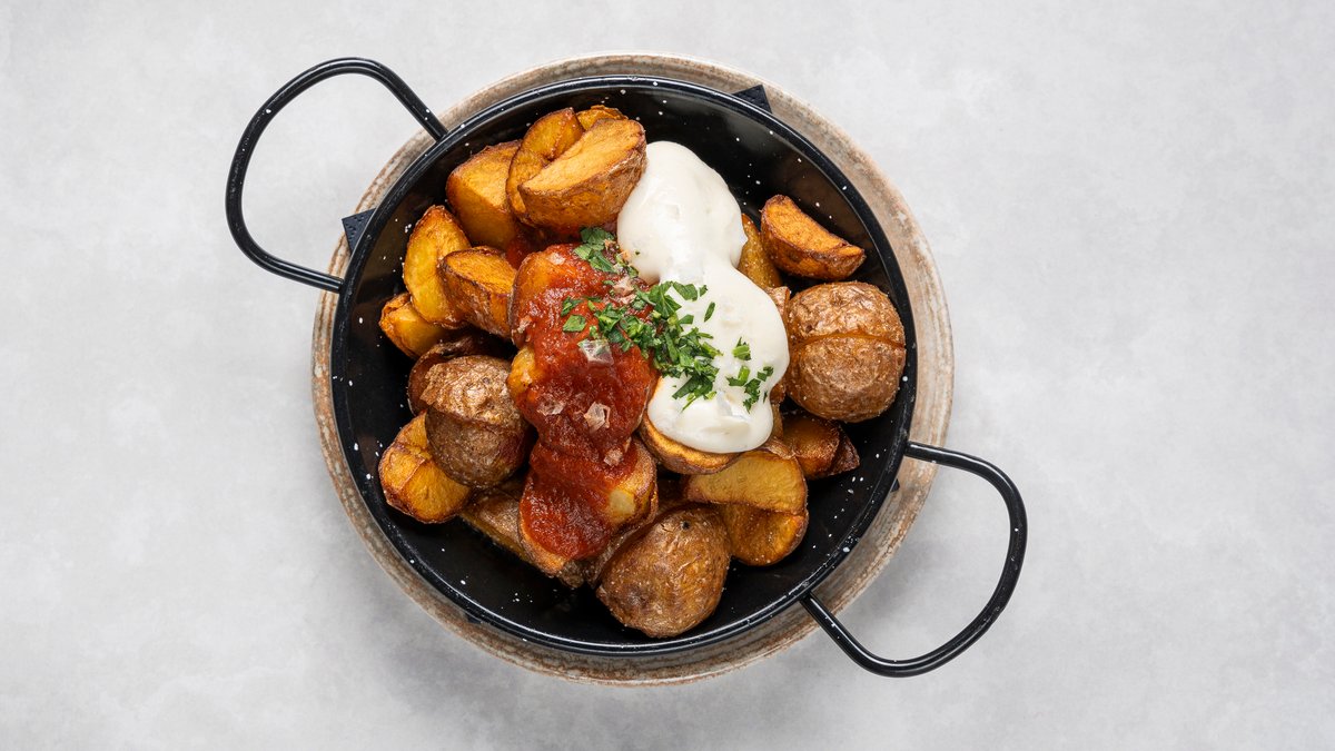 Friterade potatisklyftor med aioli och bravasås.