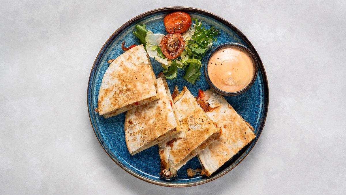 Quesadilla med kyckling och paprika. Serveras med chiliaioli.