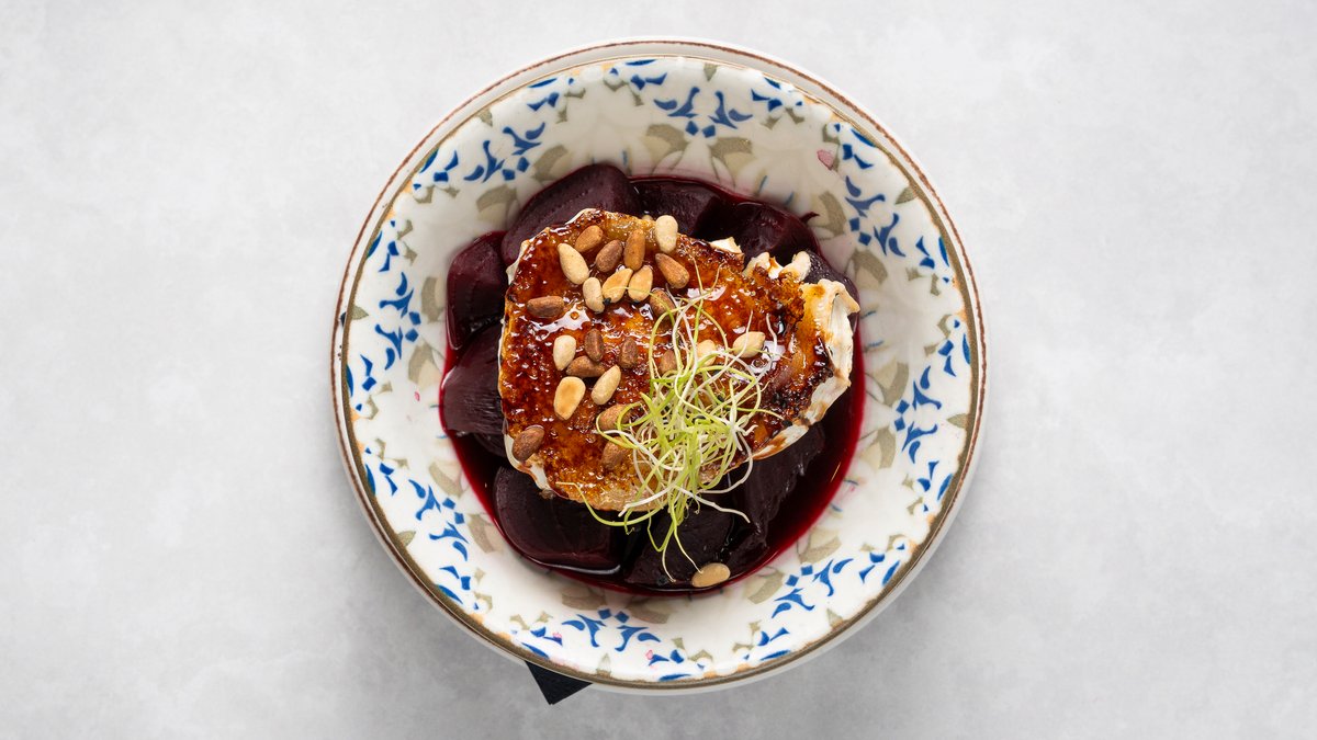 Rödbetor med karamelliserad getost, honung och pinjenötter.