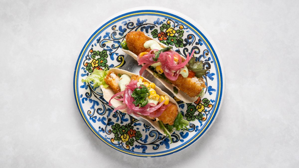 Tacos fyllda med friterad torsk, toppad med picklad rödlök och guacamole.