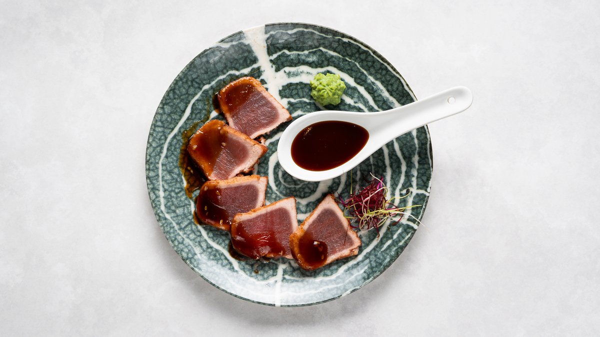 Halstrad tonfisk, serveras med teriyaki.