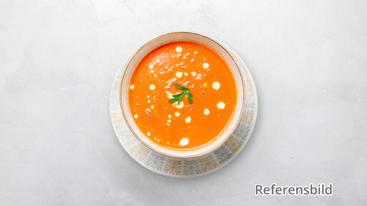Kall tomatbaserad grönsakssoppa, toppad med krutonger.