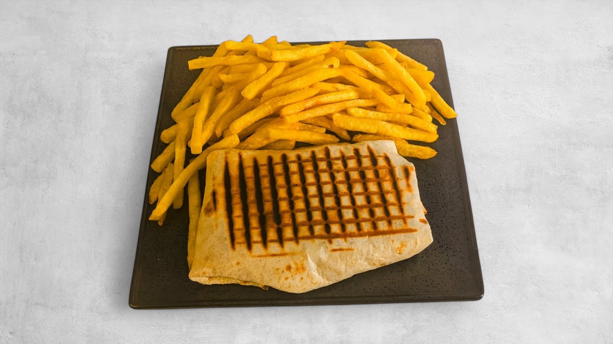 Tortilla 30 cm, nöttgyros, isbergssallad, tomat, gurka, lantchips, majonnäs, ketchup och pommes.