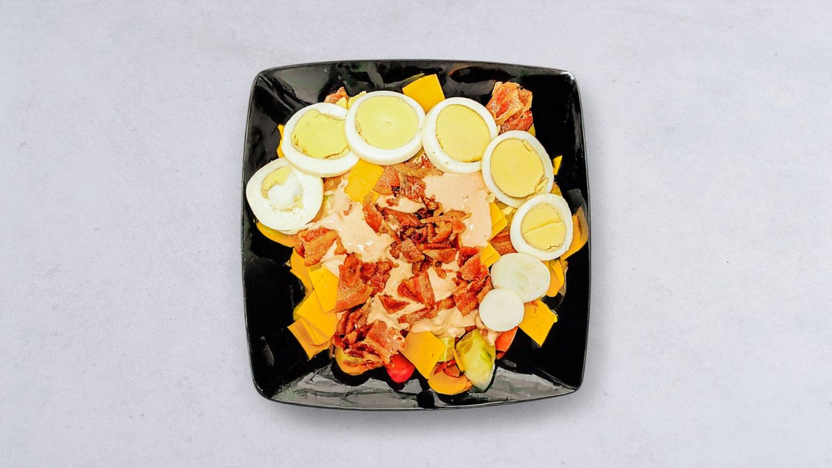 Kockens sallad med tomat, gurka, ägg, cheddarost, bacon, isbergssallad och sås.