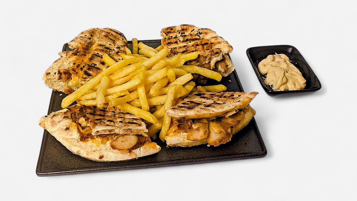 Lavas bröd, kyckling gyro, mascarpone,Gouda ost,senapssås, servera med pommes.
