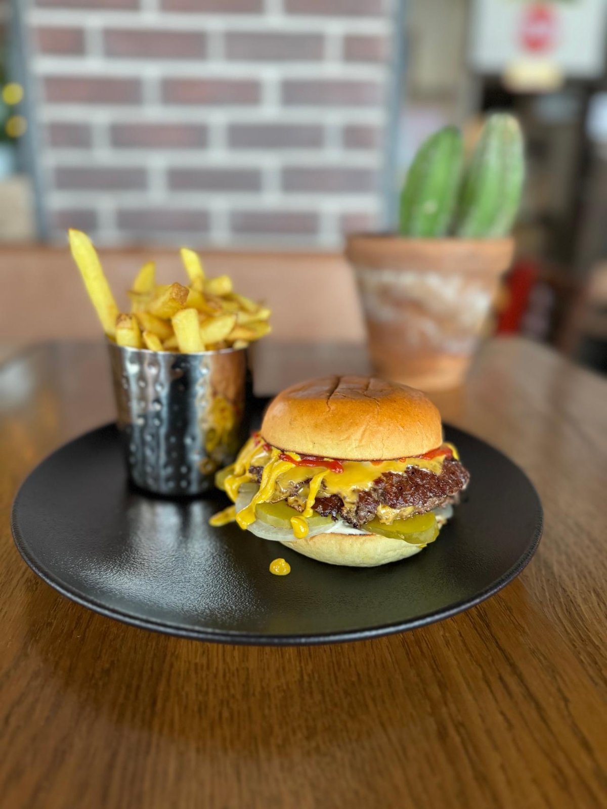 Burgare med cheddarost, majonnäs, lök, sallad, bacon & steak sauce. Serveras med coleslaw, pickles & fries.