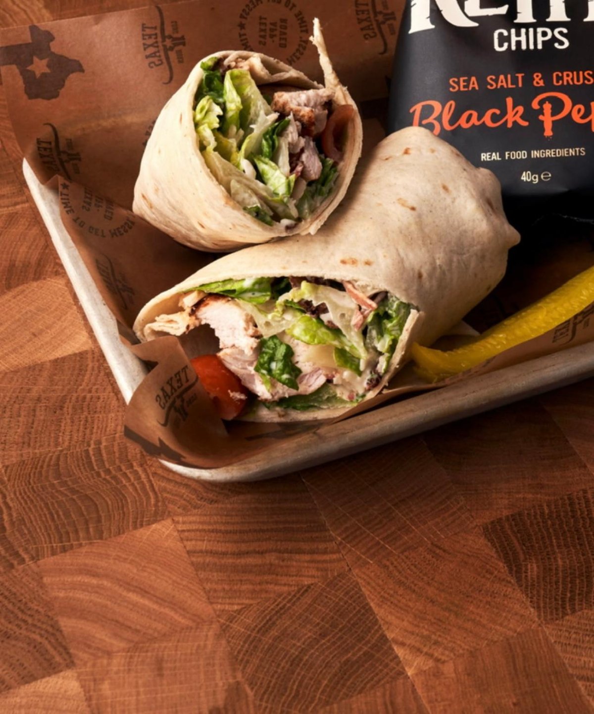 Vetetortilla med kyckling, bacon, krutonger, romansallad, parmesan & caesar dressing. Serveras med pommes.