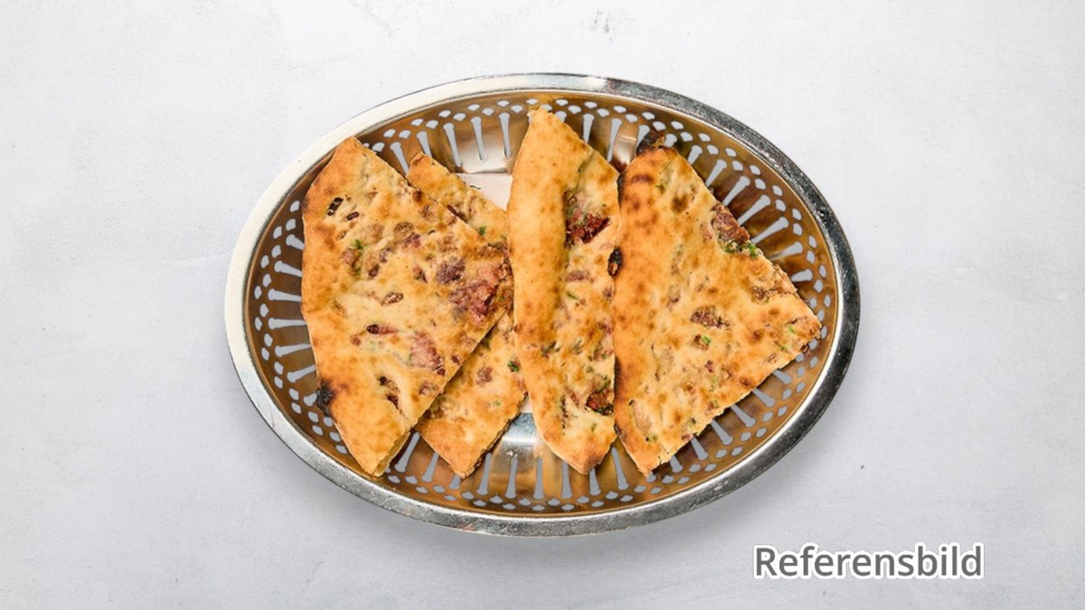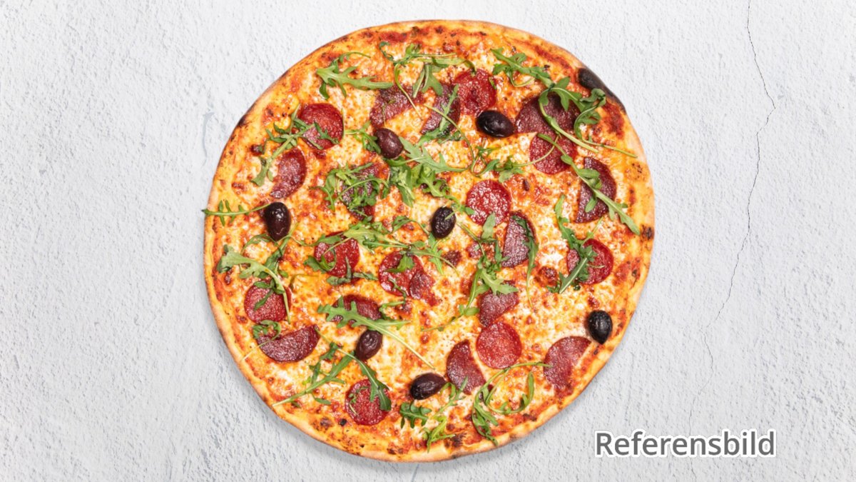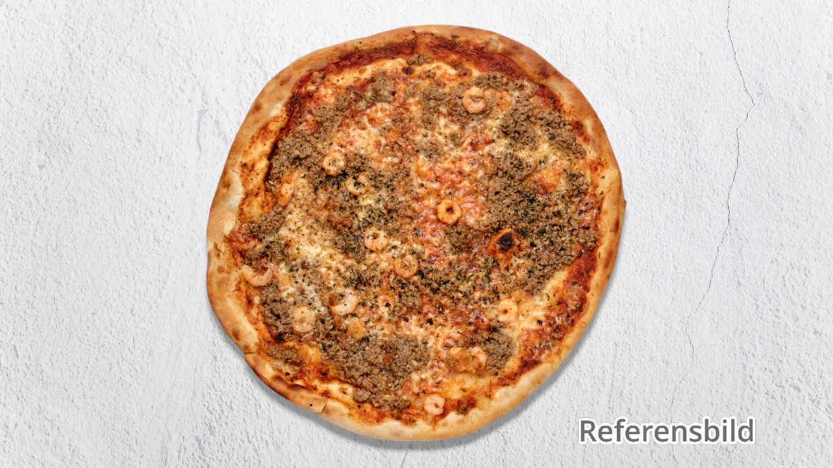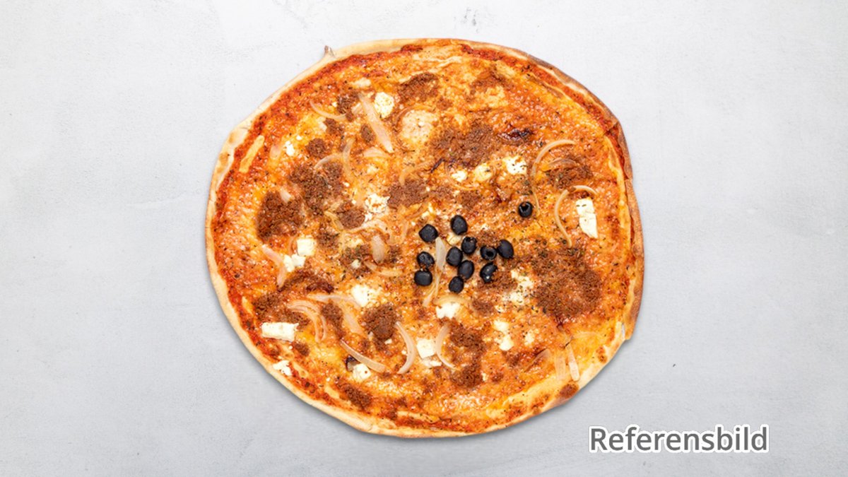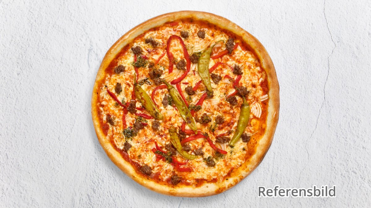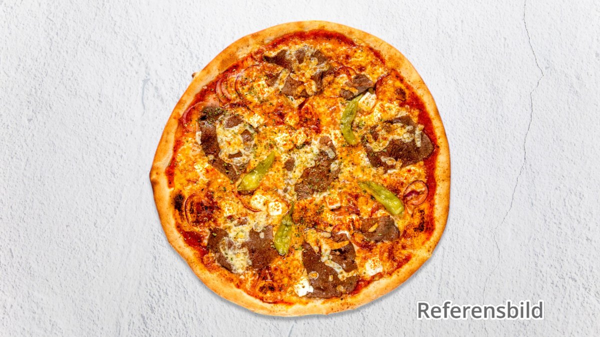 Rödlök, kebabkött (nötkött), kebabsås mild, feferoni, ost och tomatsås.