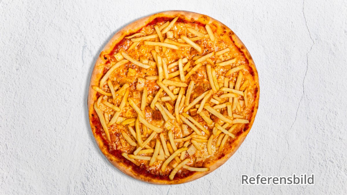 Pommes frites, kebabkött (nötkött), kebabsås mild, ost och tomatsås.