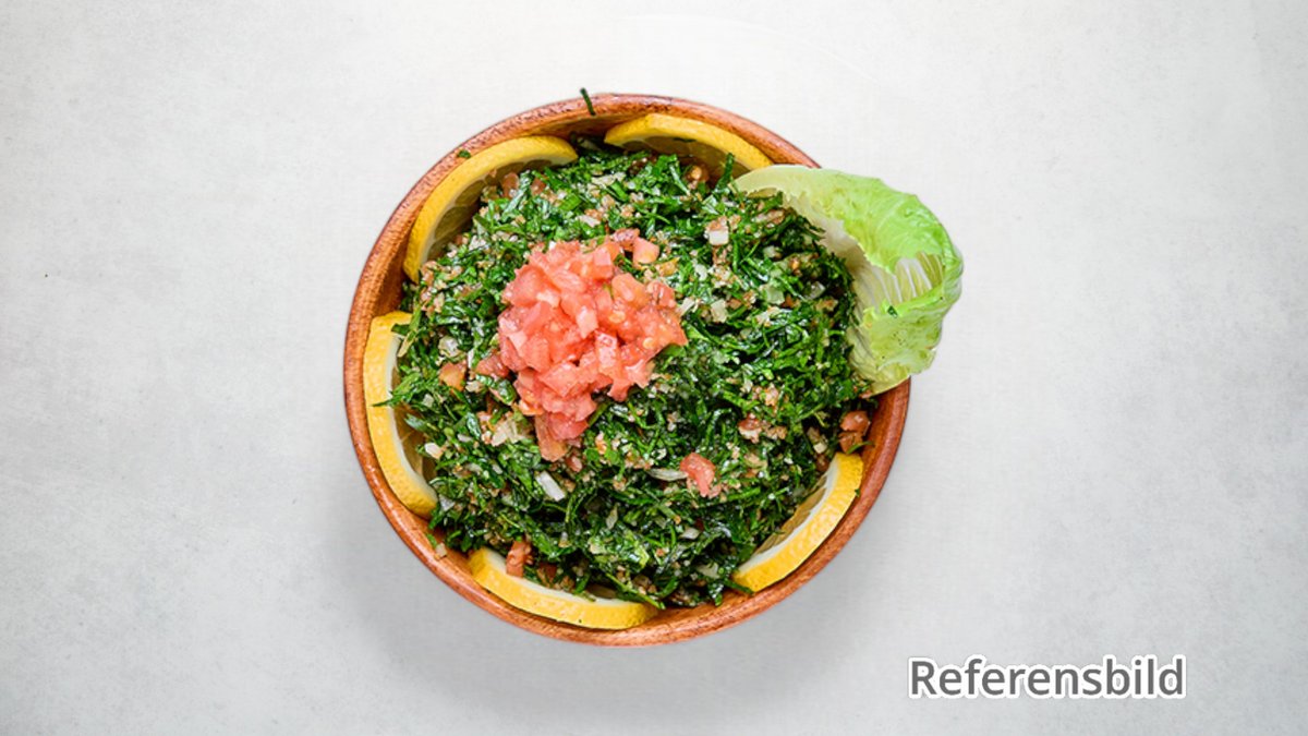 Persiljesallad med lök, tomater, bulgur, olivolja och citron.