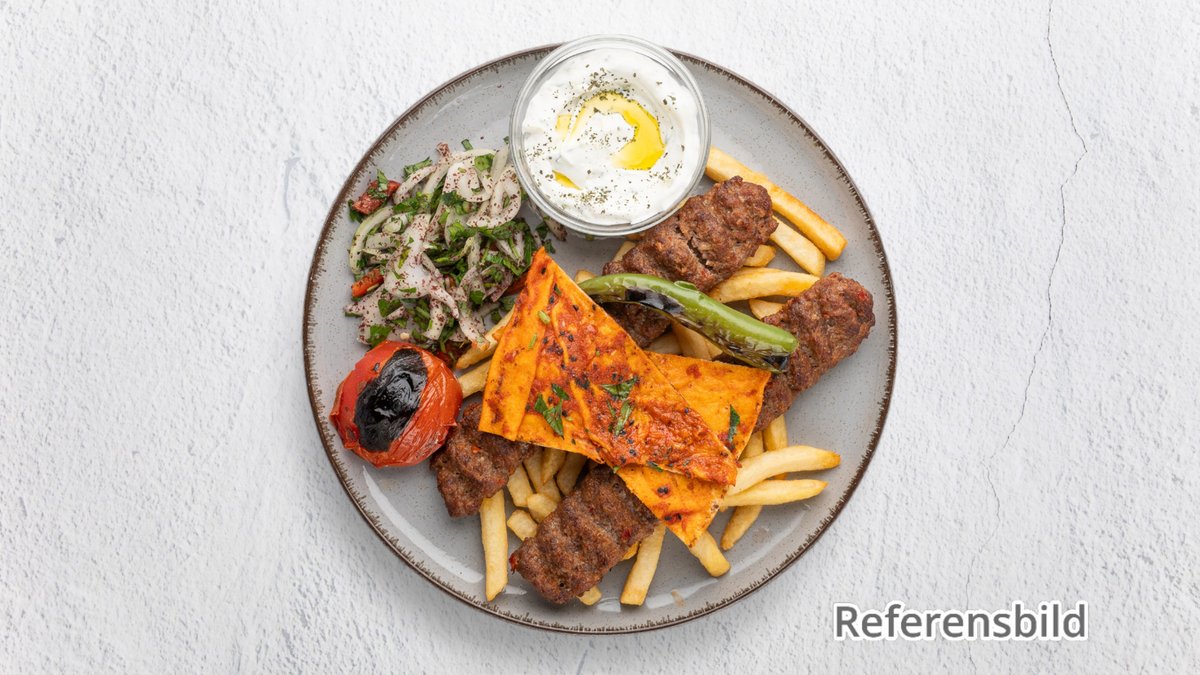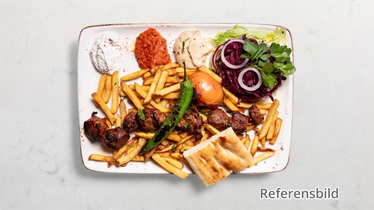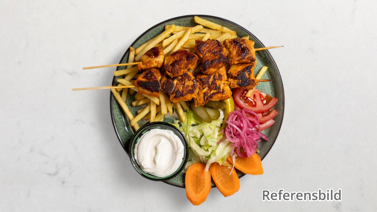 3 St spett (lamm och kyckling) serveras med ris och pommes, kockens sallad, kikärtsröra och vitlökssås.