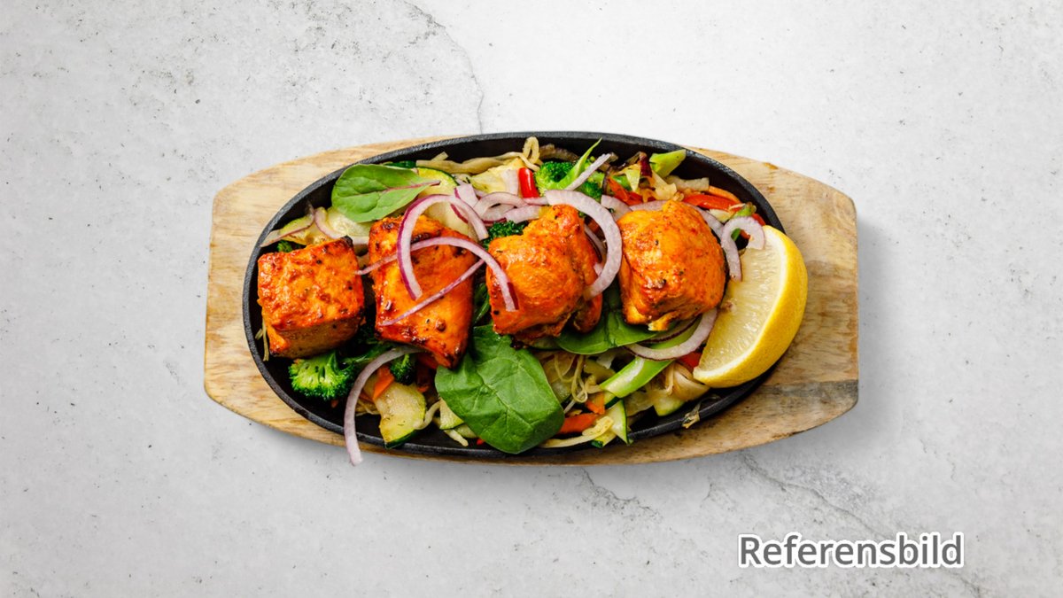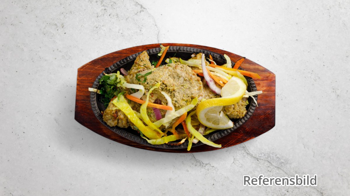 Marinerade med kockens specialmarinad, serveras med krämig kikärtsröra, inlagd gurka, kockens sallad och vitlökssås.