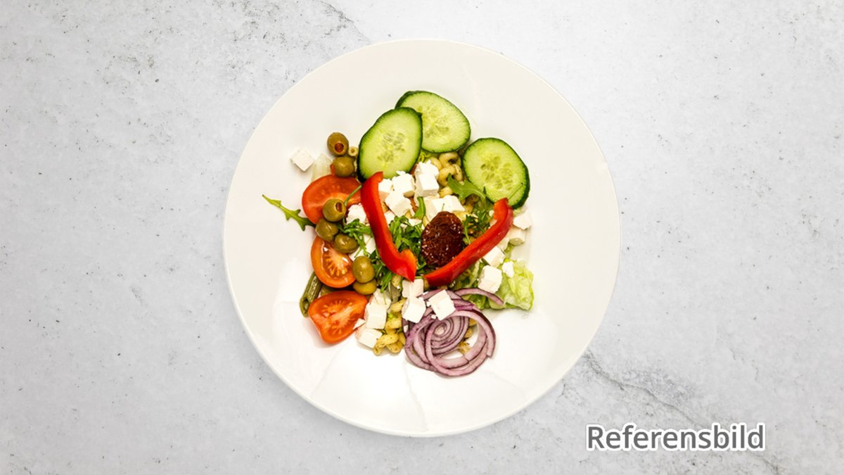 Gurka, tomat, isberg, lök majs, morot och tikka.