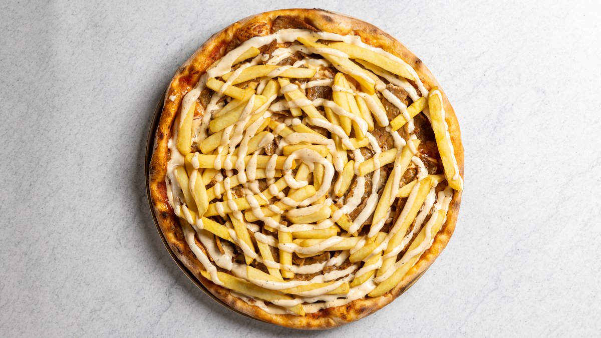 Pizza med tomatsås, ost, nöttkebab, pommes och kebabsås.