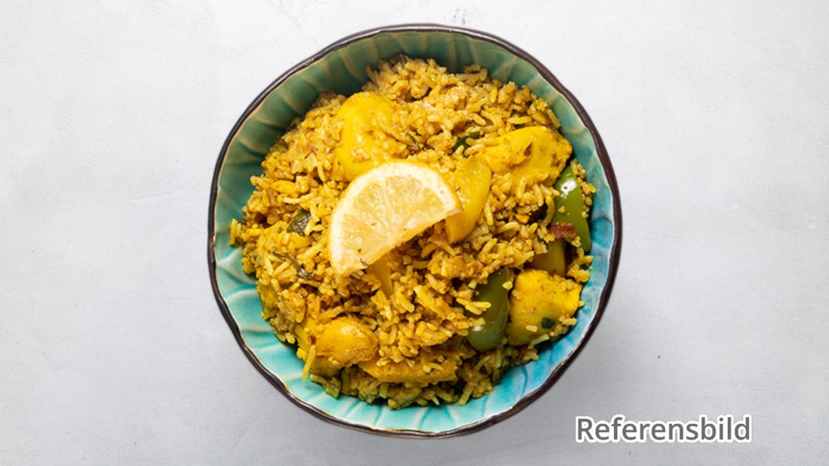 Välj mellan kyckling, vegetarisk, biff, lamm eller kungsräkor med lök, paprika, nötter och kryddor med saffranskryddat basmatiris.