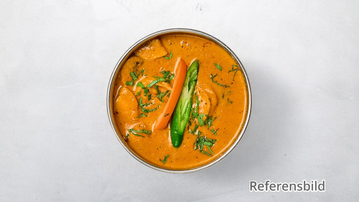 Kryddmarinerad stekt pumpa med grön papaya, aubergine, ingefära, vitlök, tomat, koriander, yoghurt och kokos i cashewnötsås.