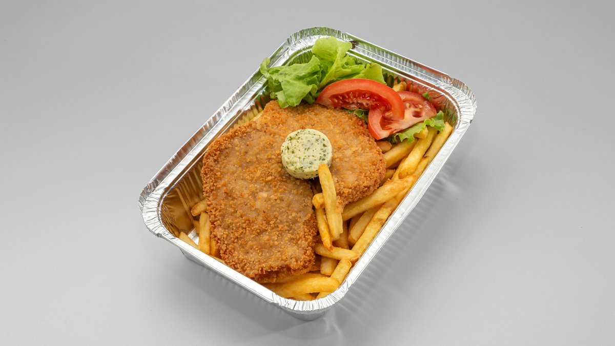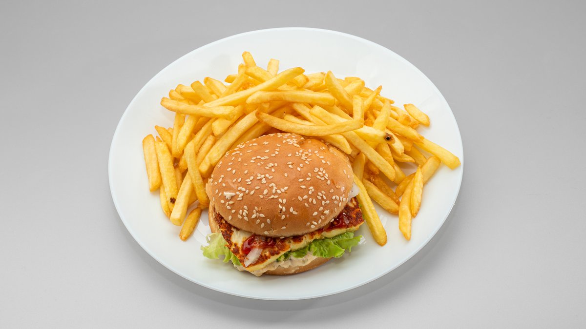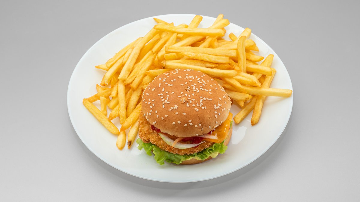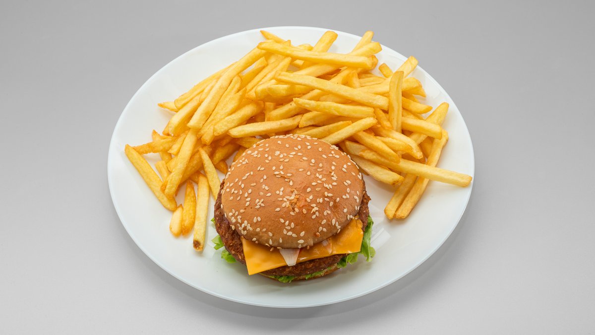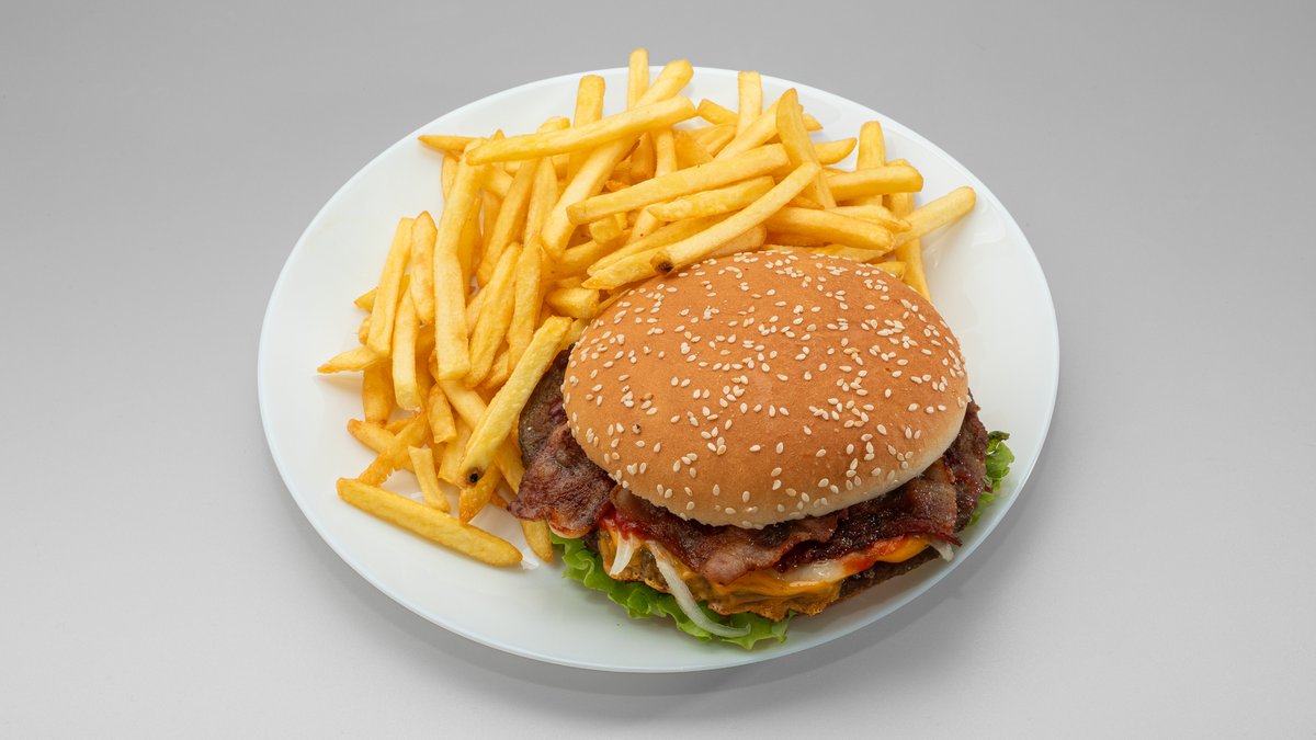 Dubbel ostburgare med pommes och 33 cl dryck. Sallad, dressing, lök, ketchup och smält cheddar.