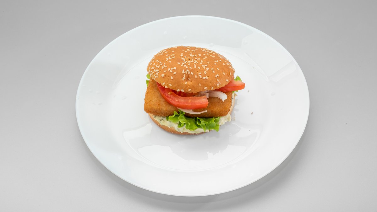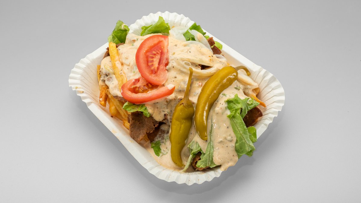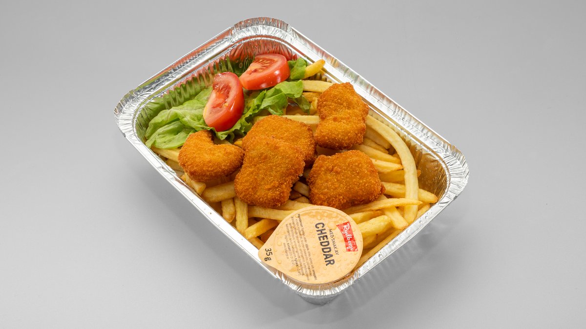 Gurkmajonnäs, sallad, lök och tomat. Pommes & dryck.