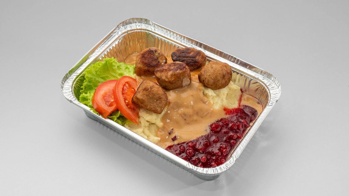 Köttbullar, mos, brunsås, lingonsylt och sallad.
