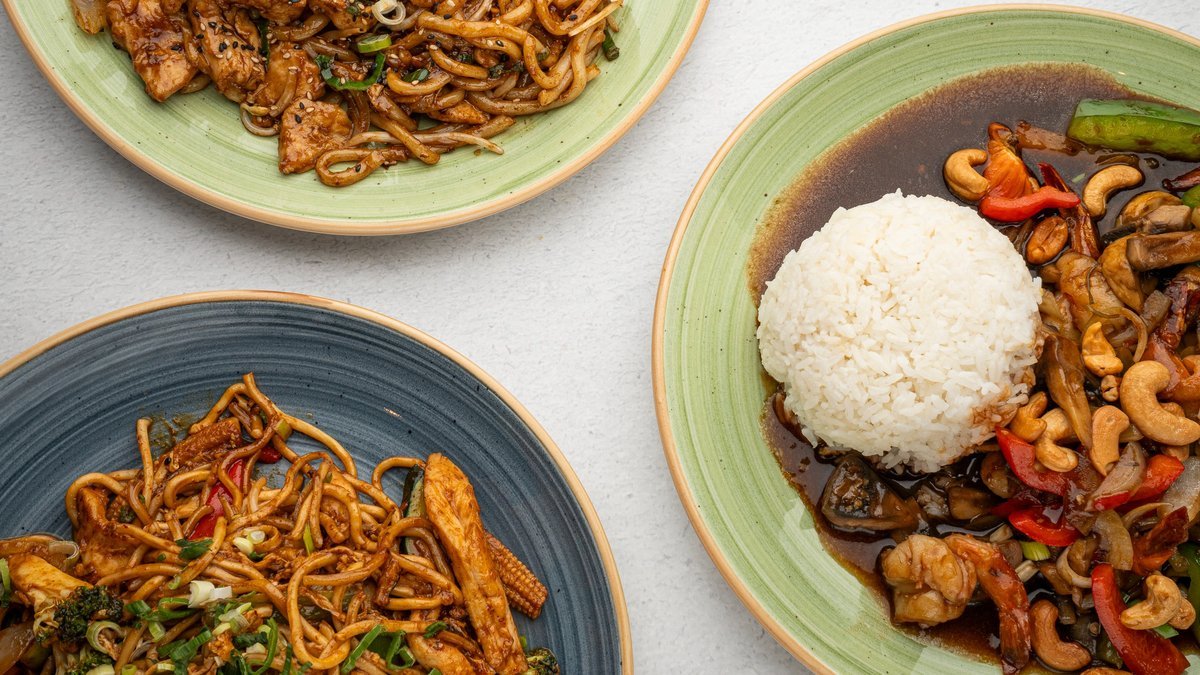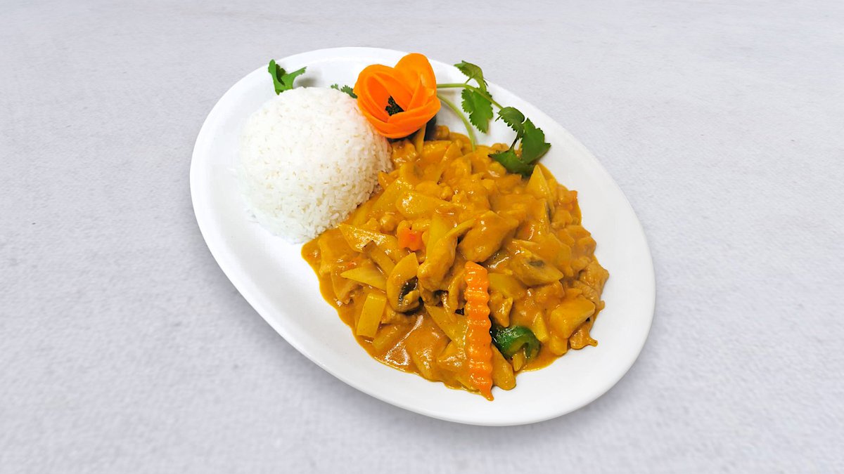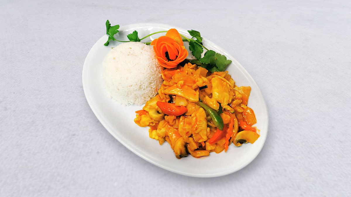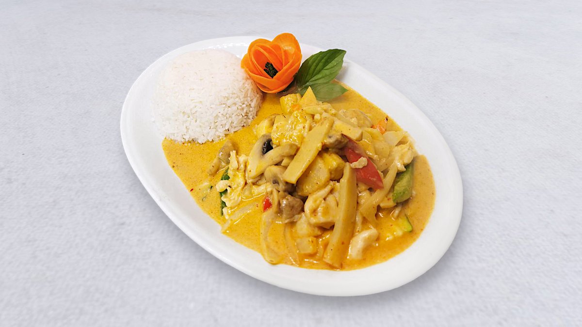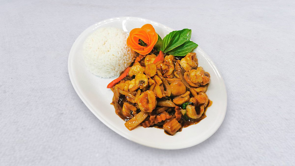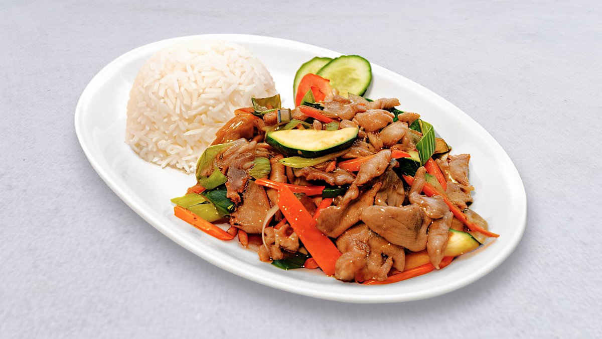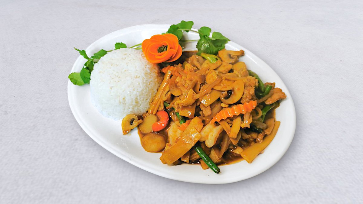 Ris, bambuskott, champinjoner, morötter, lök, minimajs, vattenkastanj, zucchini, paprika och söt basilika. Välj protein i nästa steg.