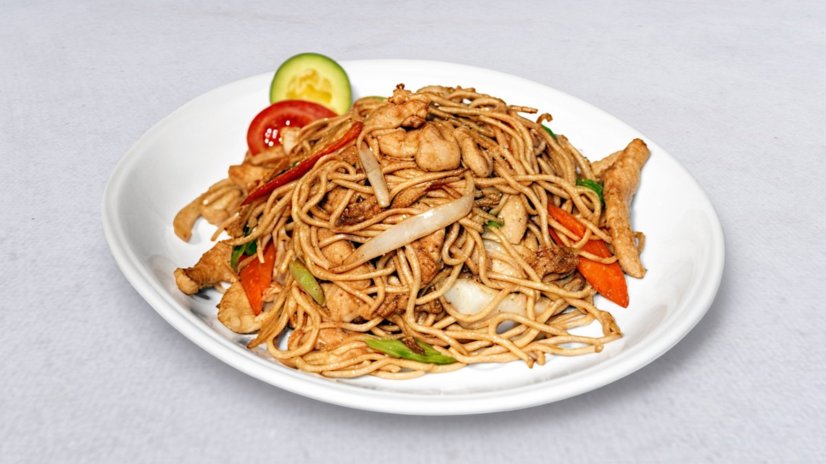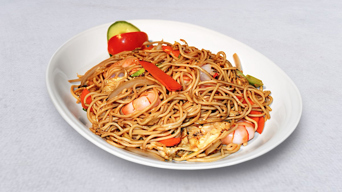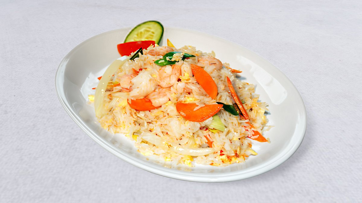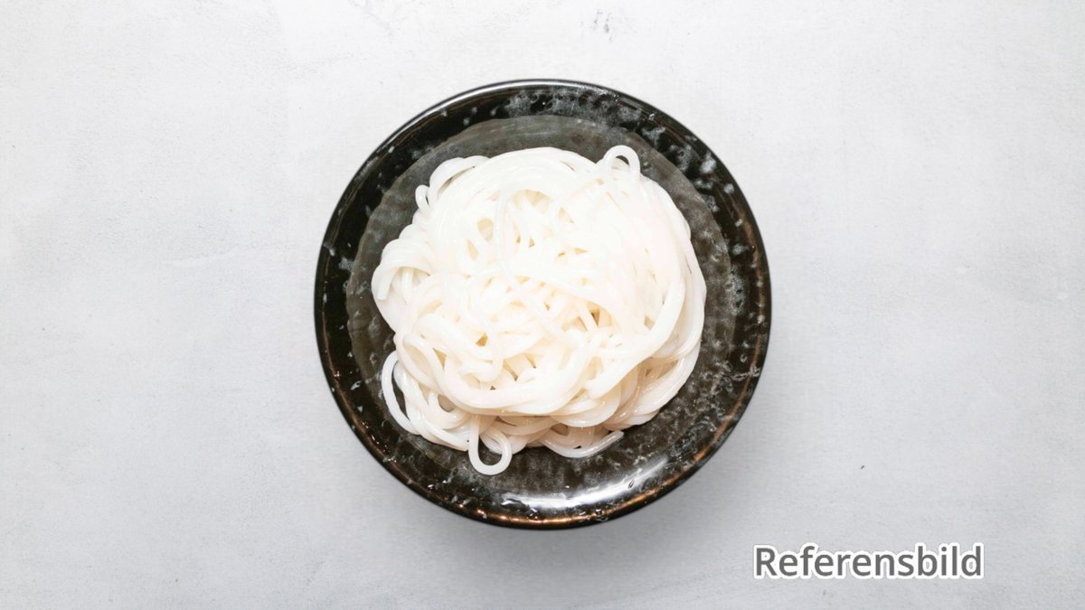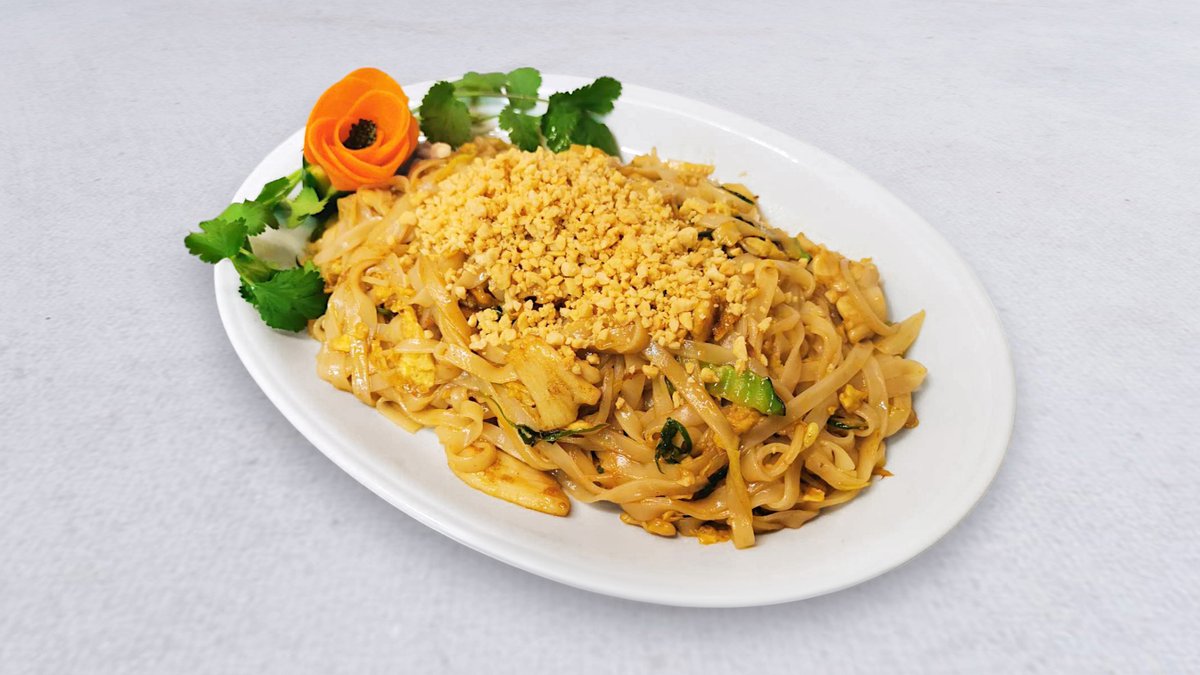 Risnudlar, ägg, jordnötter, purjolök, morötter och lök.