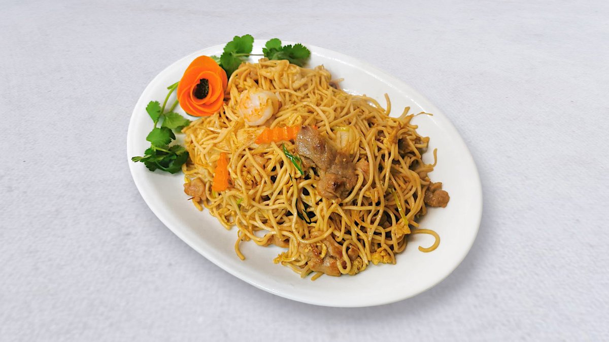 Lite stark. Kyckling, fläskfilé, små räkor, ägg, morötter, lök, vitlök, purjolök och groddar.