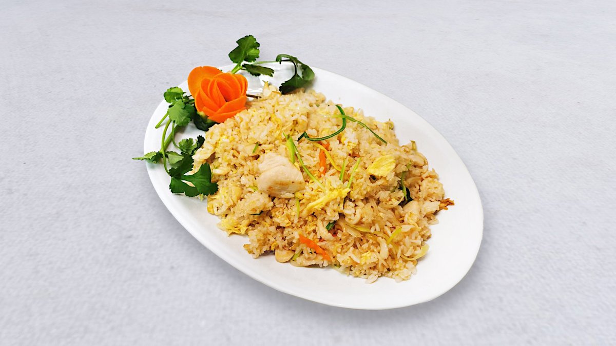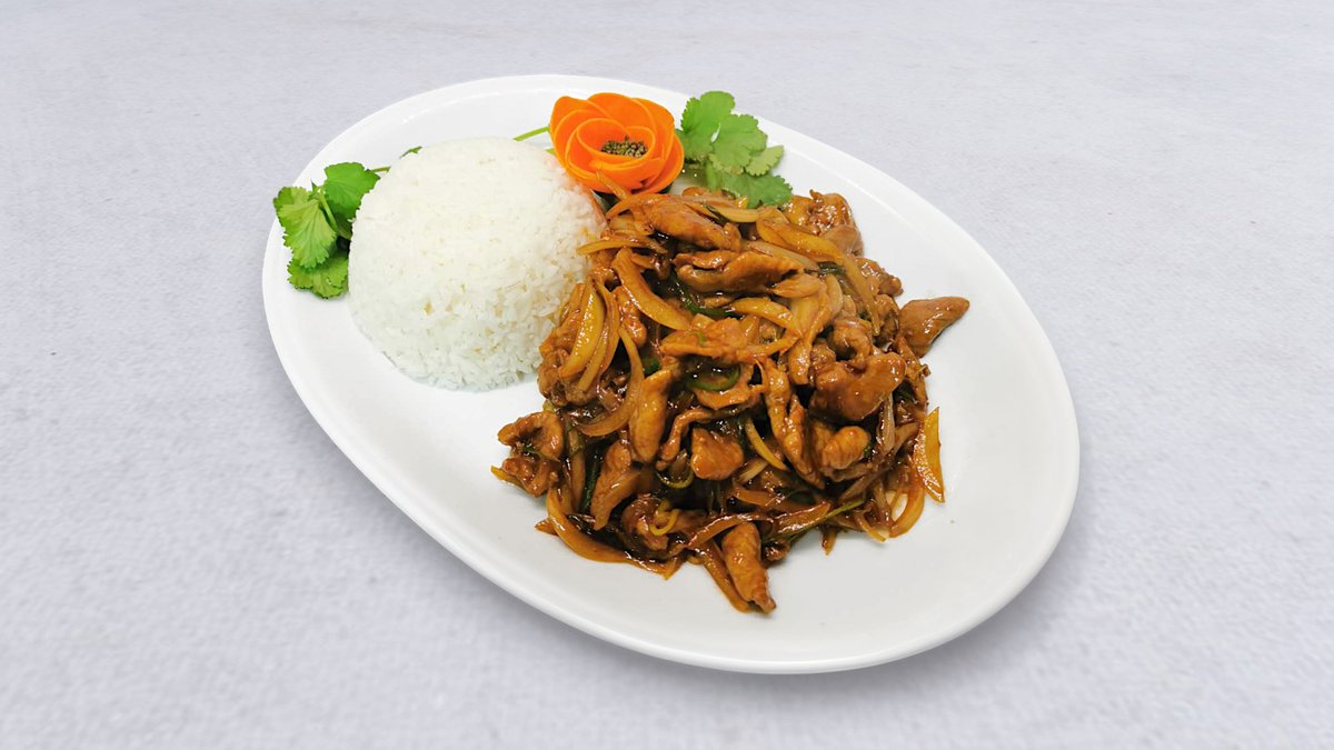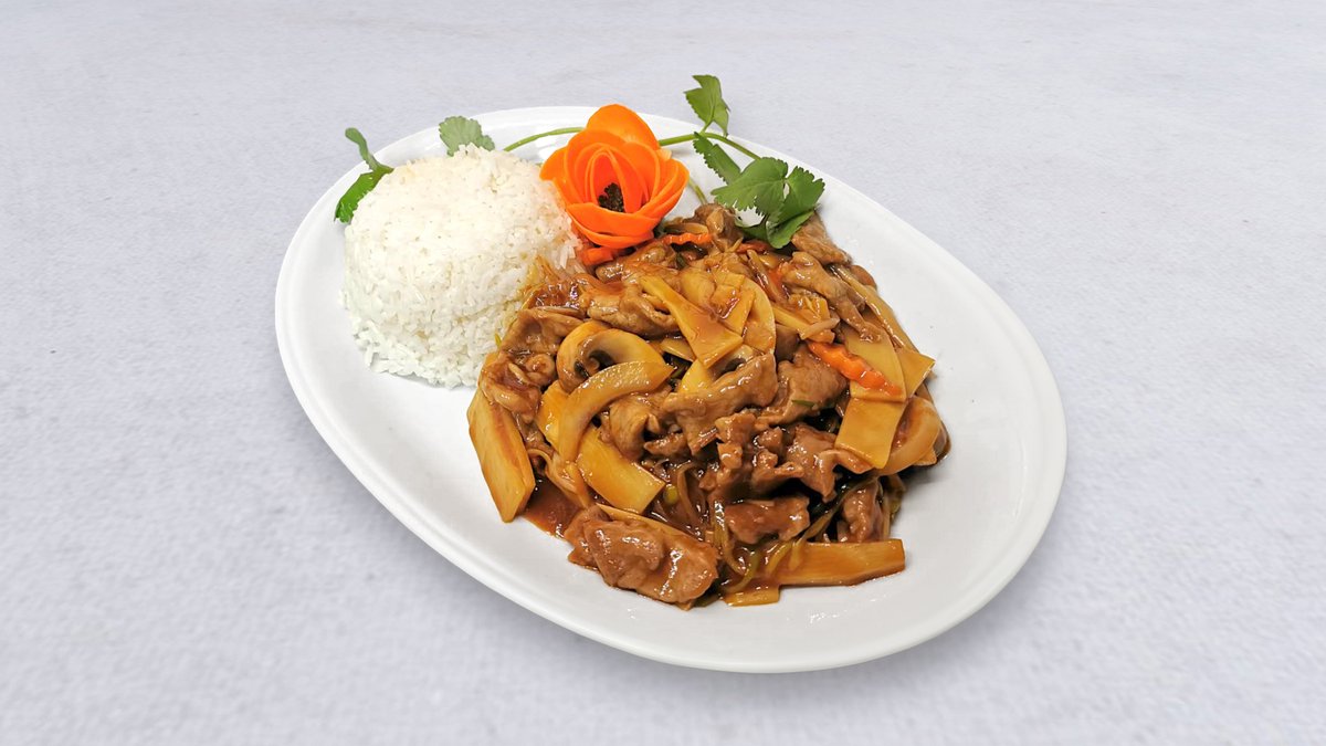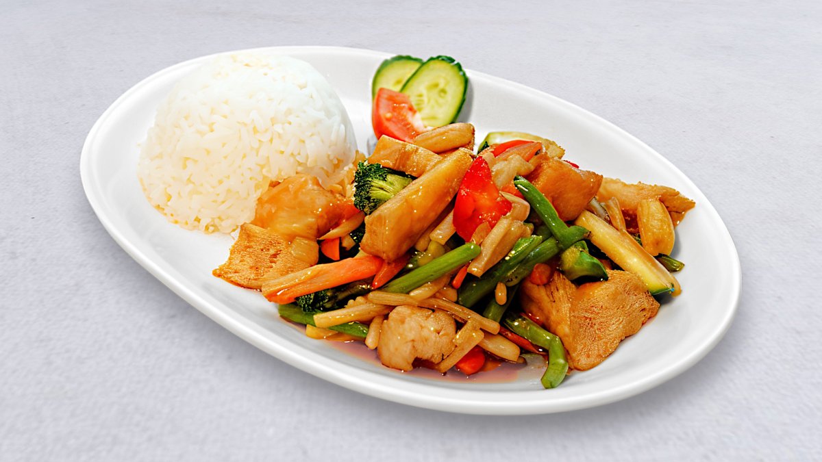 Ris, bambuskott, champinjoner, purjolök, morötter och lök. Välj protein i nästa steg.