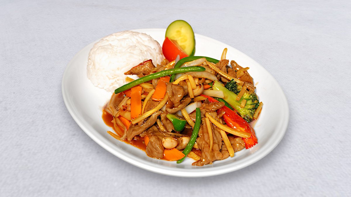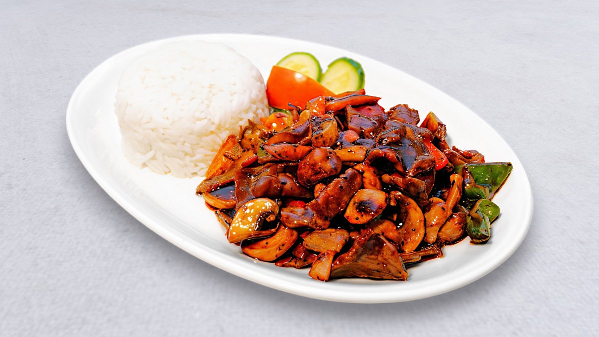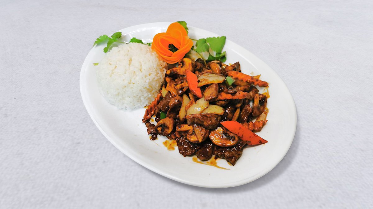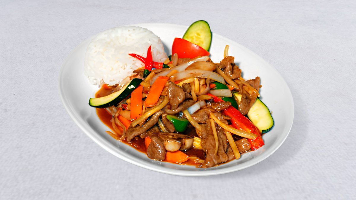 Ris, biff, champinjoner, morötter, lök och paprika.