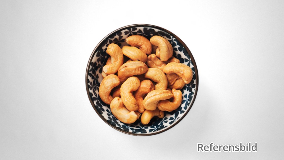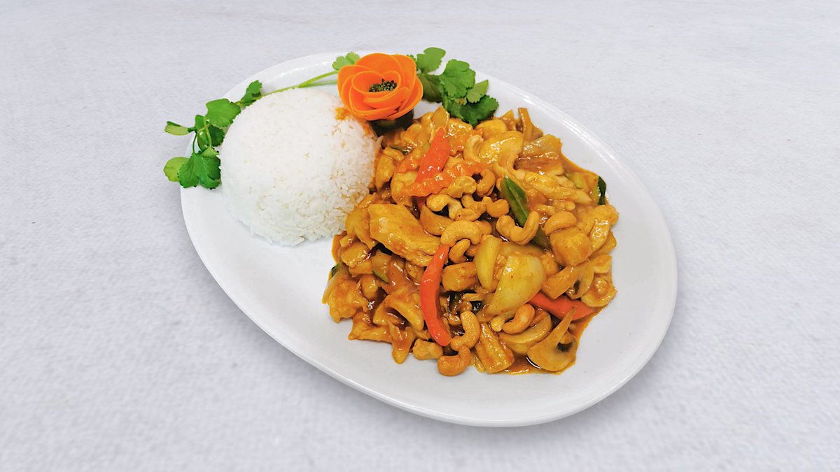 Ris, cashewnötter, champinjoner, morötter, lök, minimajs, zucchini och paprika.