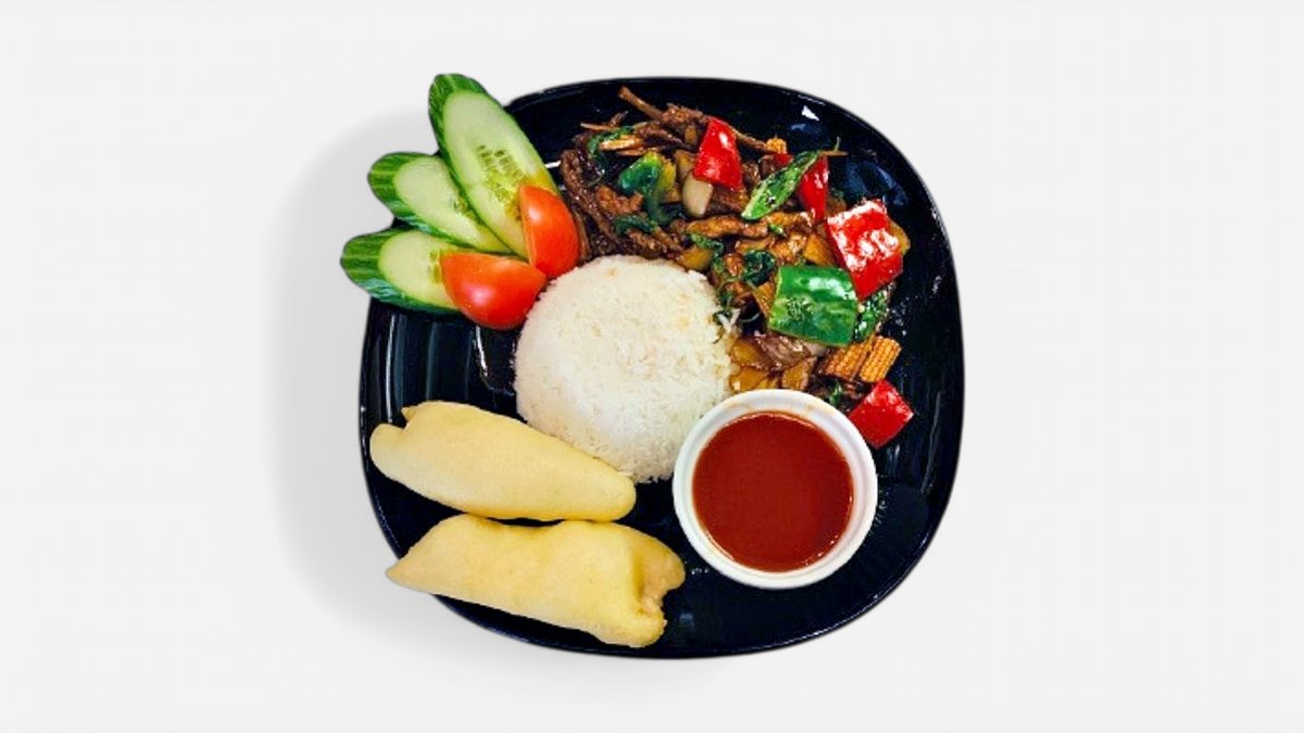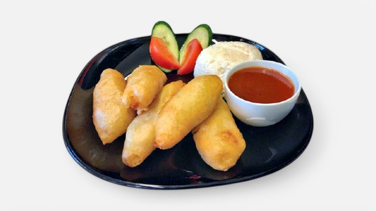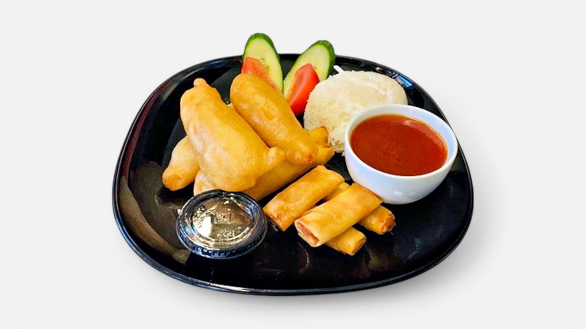 Serveras med ris och vårrulle. Välj mellan Sötsur sås, Curry sås eller Jordnötssås