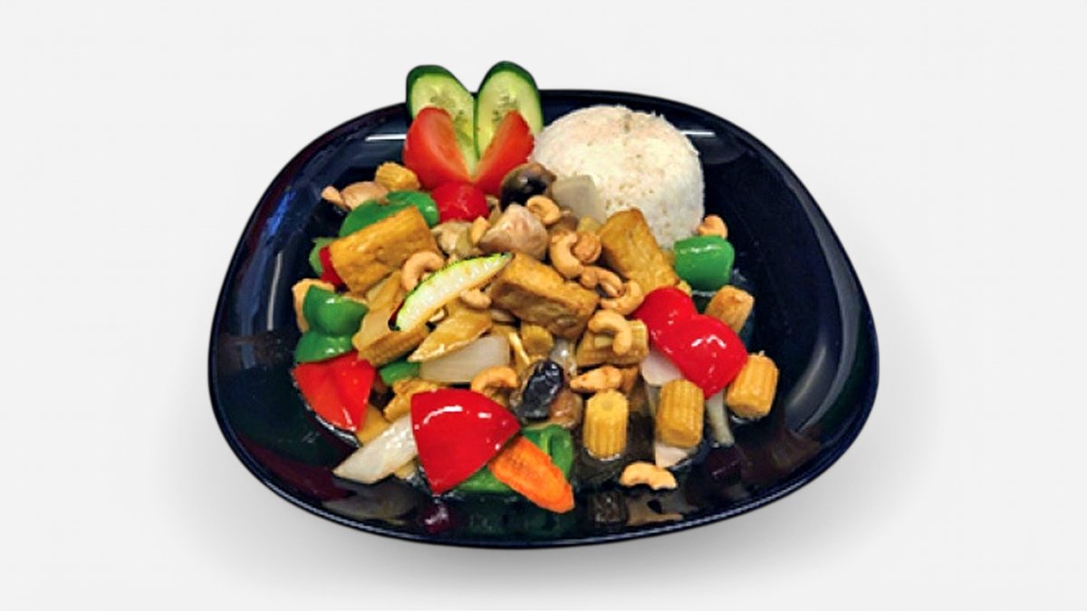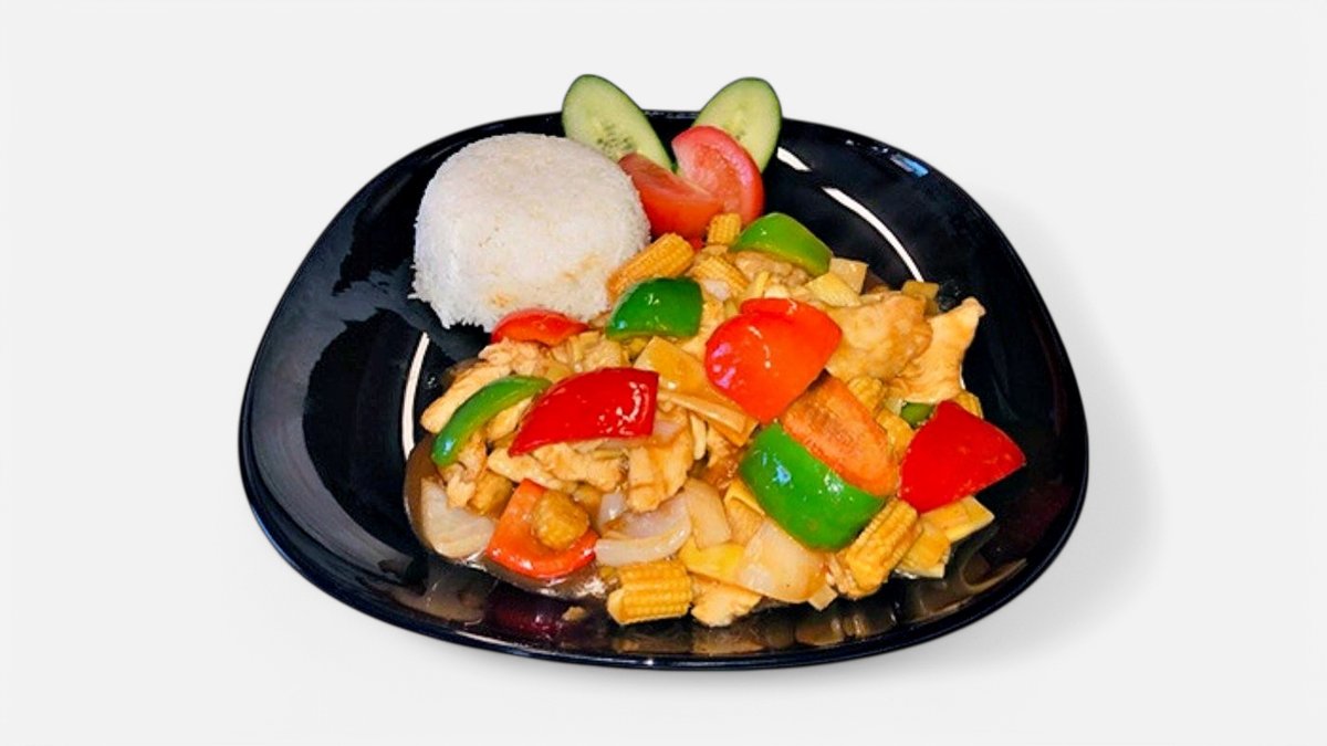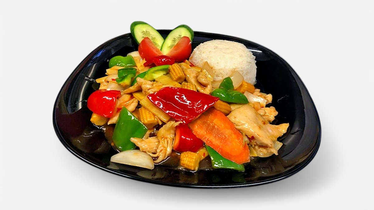 (Stark). Vegetarisk. Paprika, lök, morötter, majs, champinjoner, bambuskott, lime och chilisås. Serveras med ris. Glutenfri.