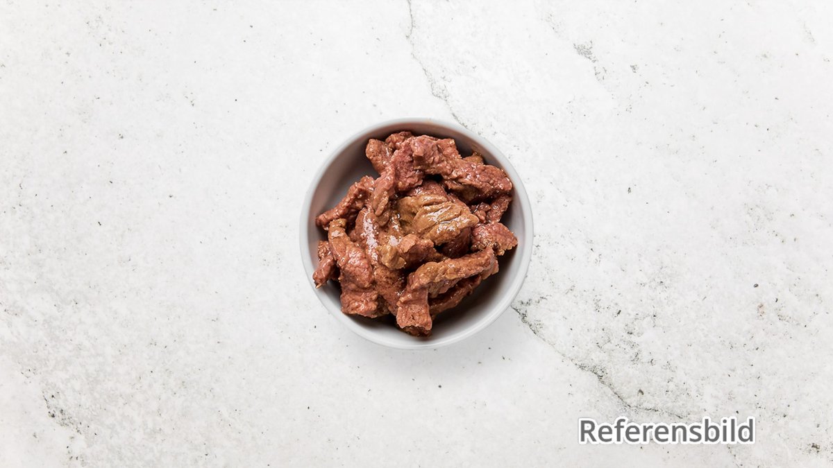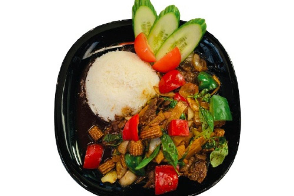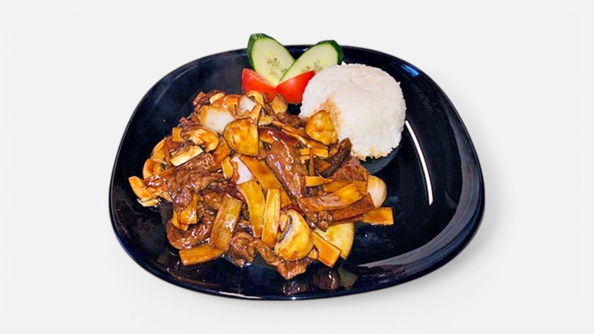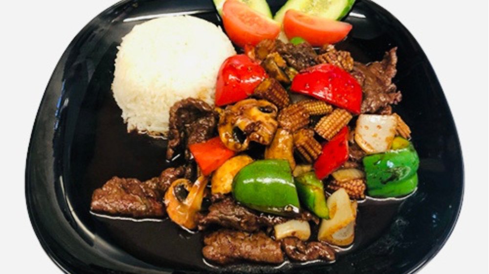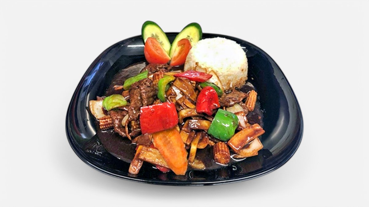 (Stark). Ryggbiffwok med lök, paprika, champinjoner, minimajs och chili. Serveras med ris.