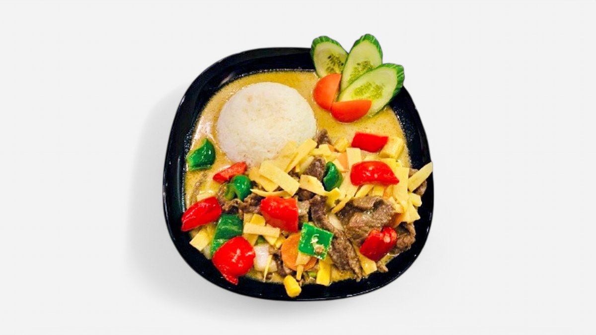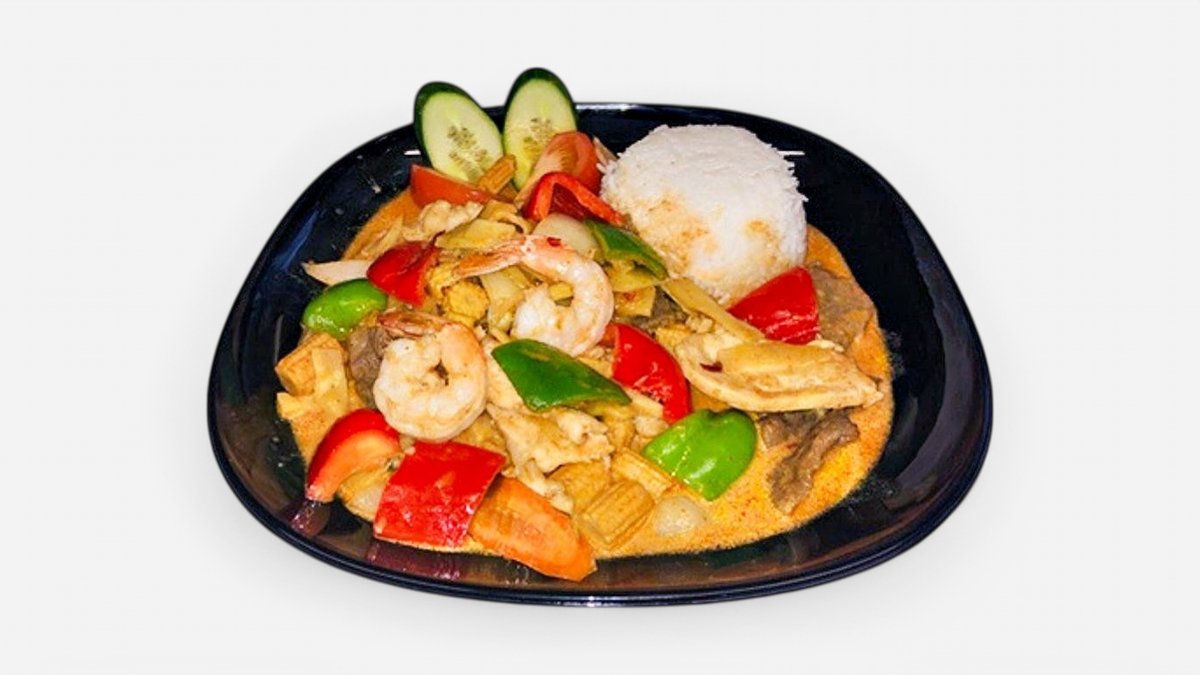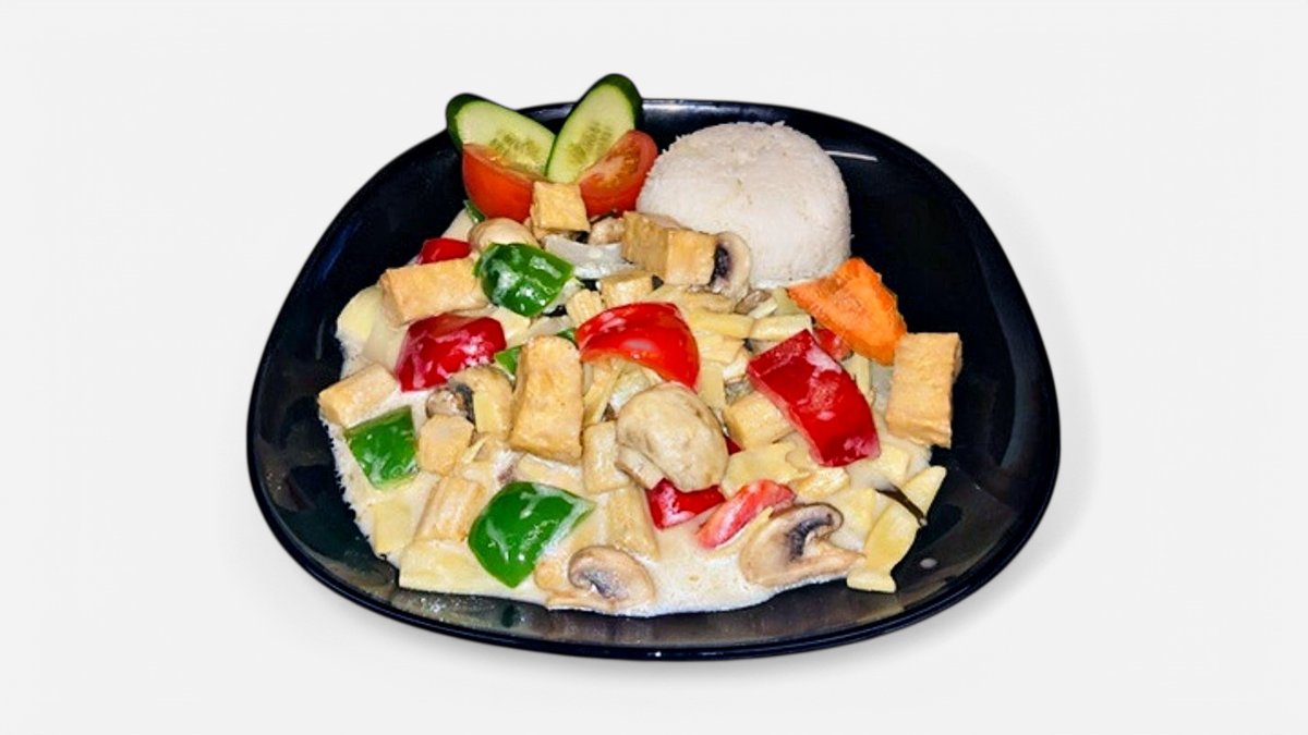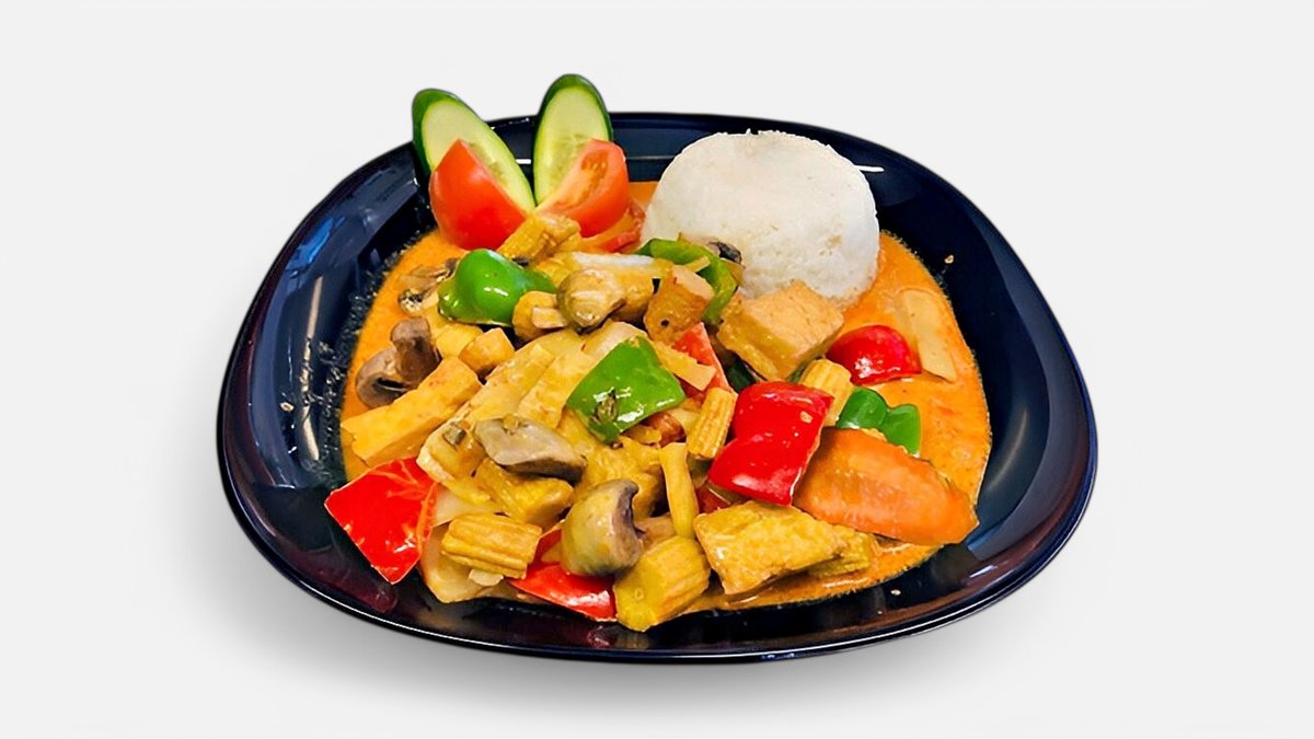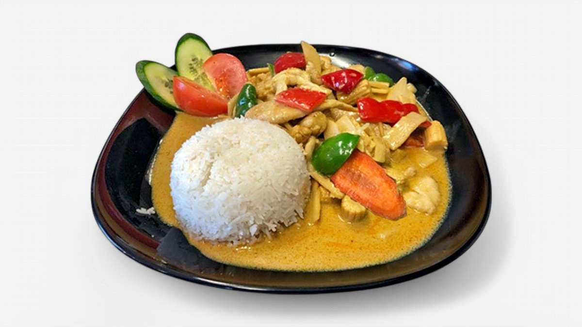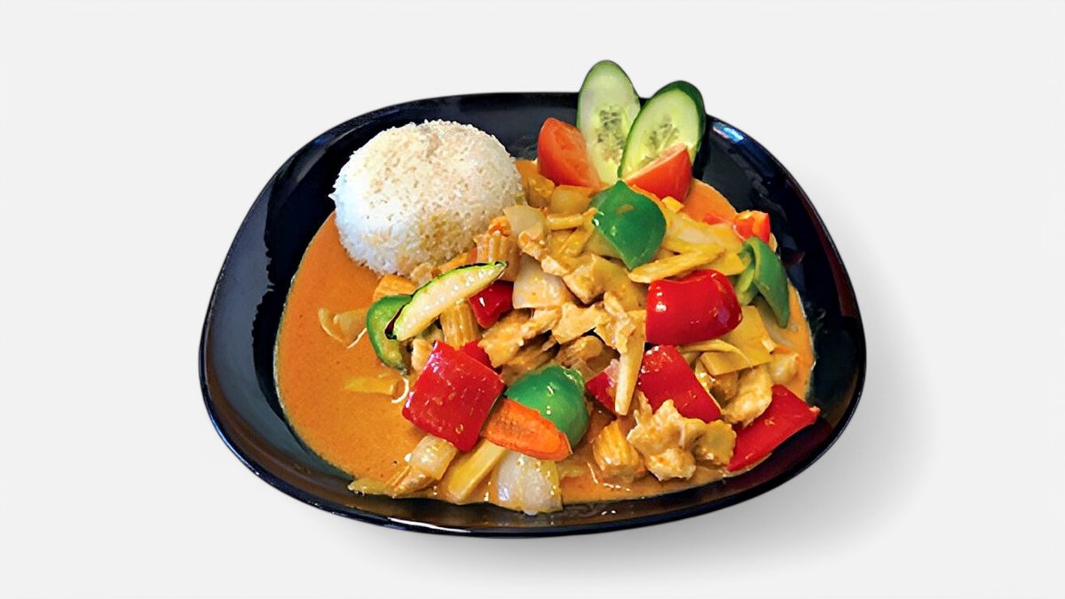 Serveras med grönsaker. Välj mellan rödcurry eller gulcurry.