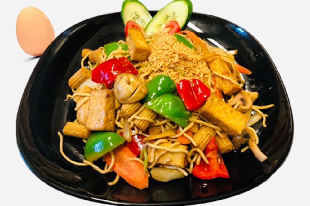 Stekta äggnudlar med kycklingfilé, ryggbiff vitkål, paprika, morötter, ägg och jordnötter.