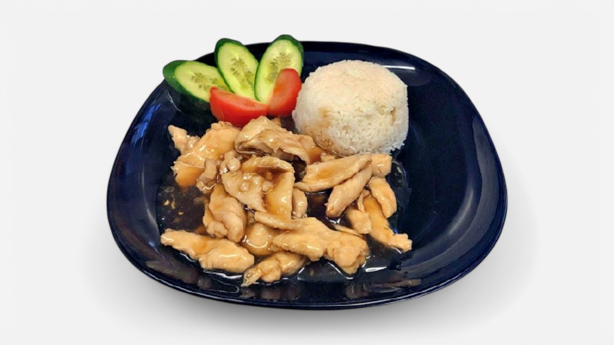 Ryggbiff Basilika / Friterad Kyckling,morötter, zucchini, välj mellan Sötsursås, Currysås eller Jordnötssås. Serveras med ris.
