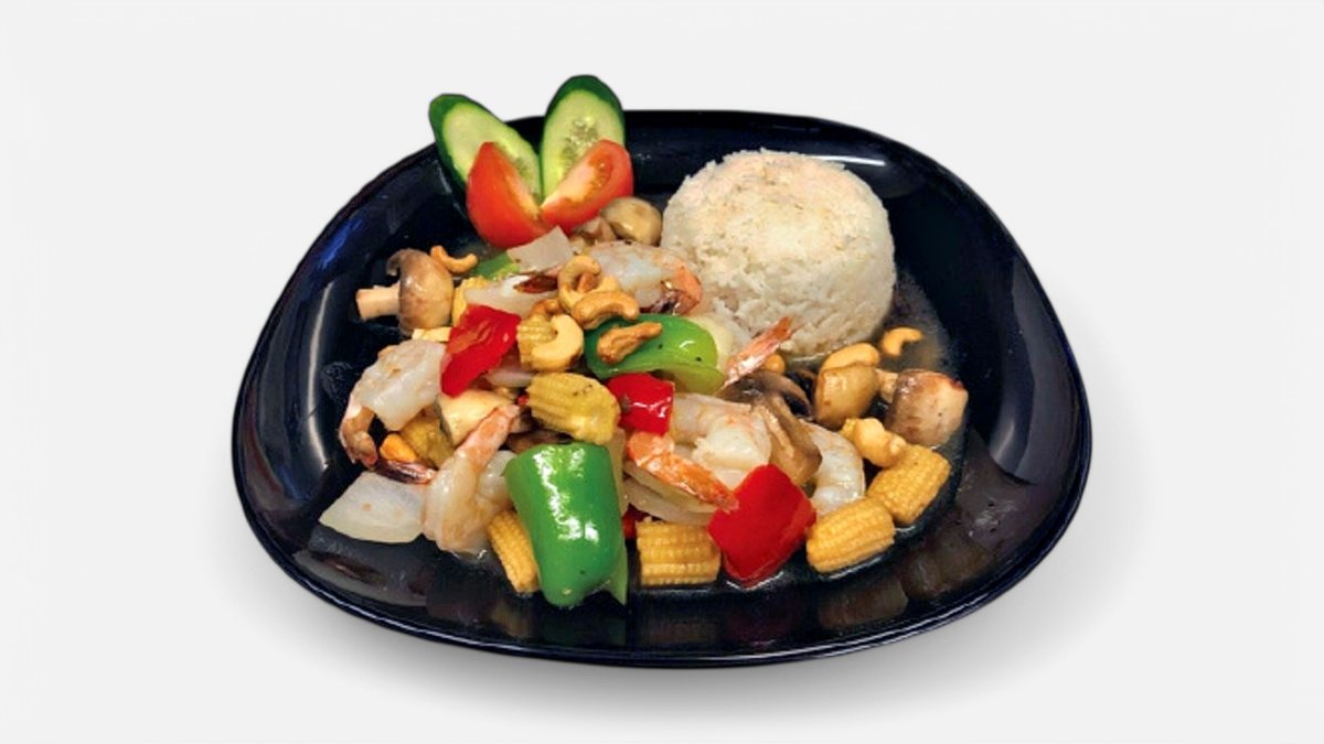 (Stark). Tigerräkor med lök, paprika, champinjoner, mini majs, cashewnötter, vitlök och chilisås. Serveras med ris.