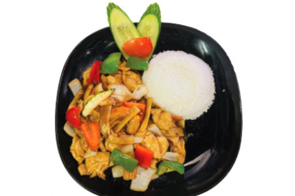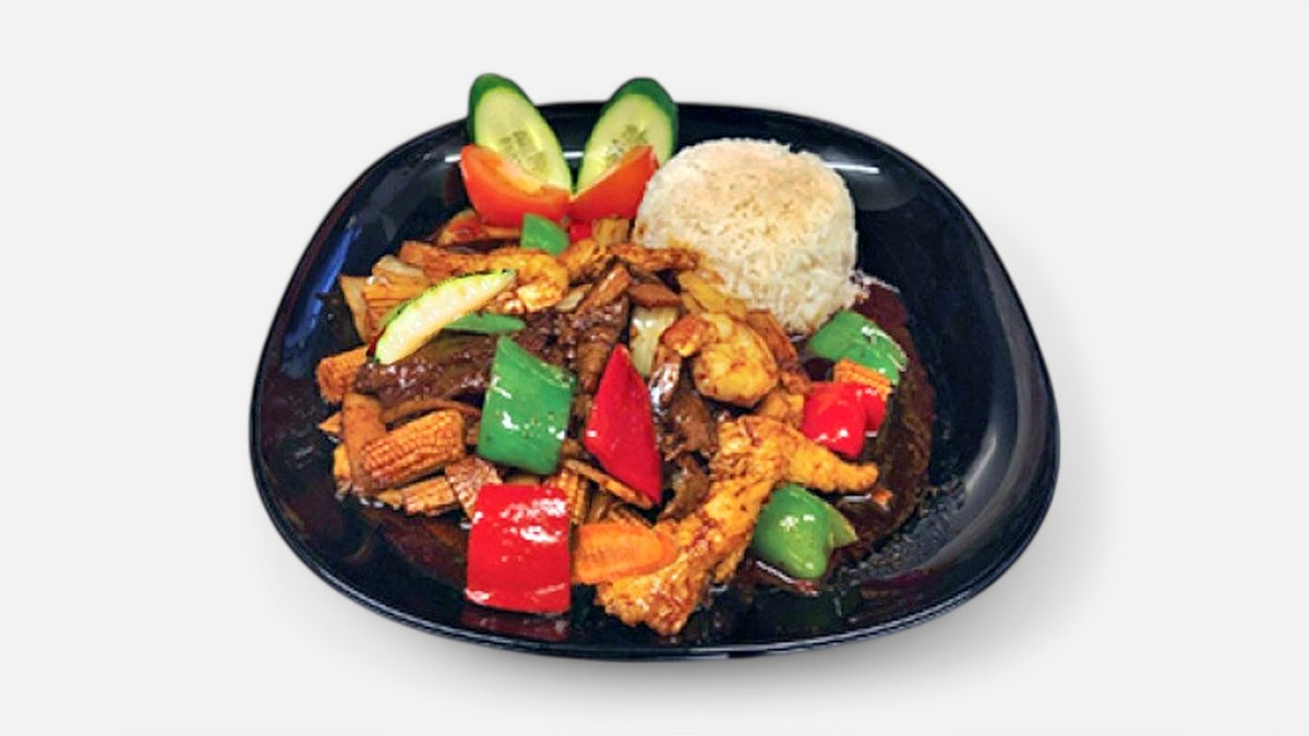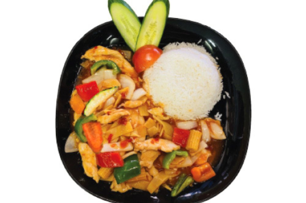 (Stark). Paprika, lök, zucchini, morötter och bambuskott. Serveras med ris. Kycklingfilé, ryggbiff, räkor.