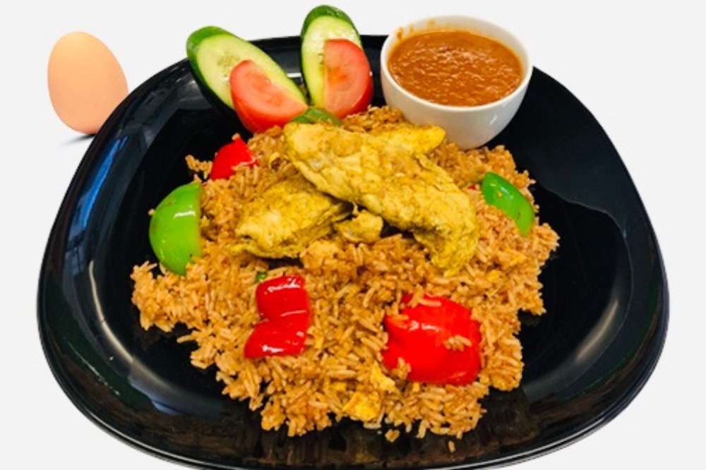 Stekt ris, ägg och med kycklingfilé och ryggbiff.