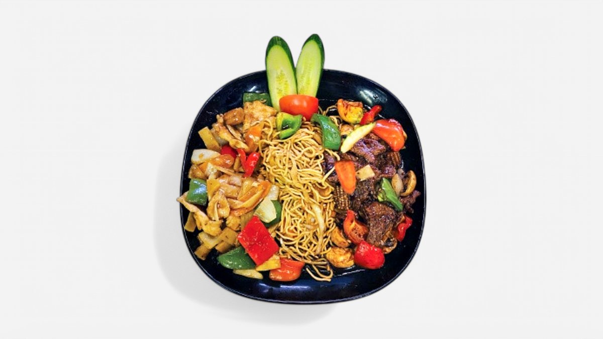 Kyckling med cashewnötter, Ryggbiff med bambuskott morötter, zucchini och champinjoner (stark). Serveras med stekta nudlar.