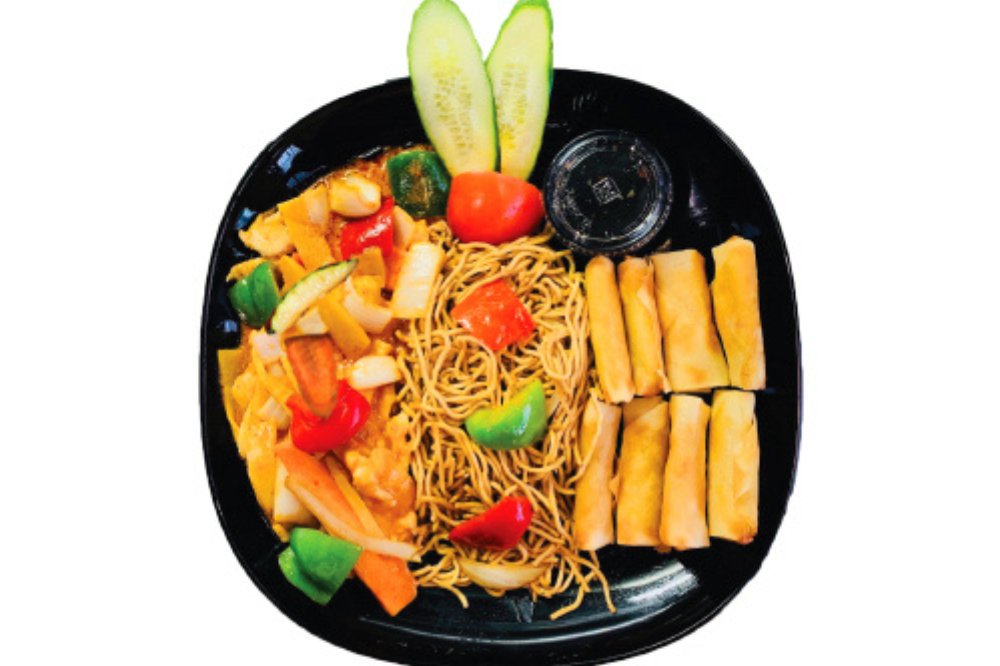 Kyckling i röd currysås (stark) morötter, zucchini, 8 st vårrullar med speciell fisksås och stekta nudlar.
