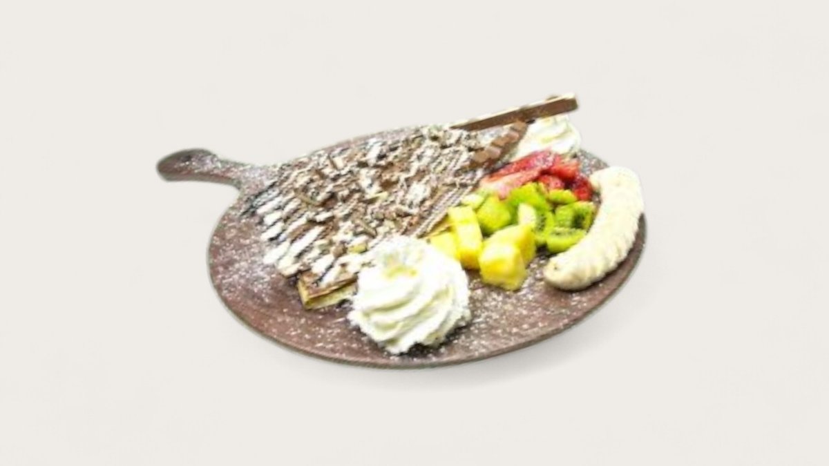 Crepes rullad i banan, nutella, choklad, vitchoklad & frukt
